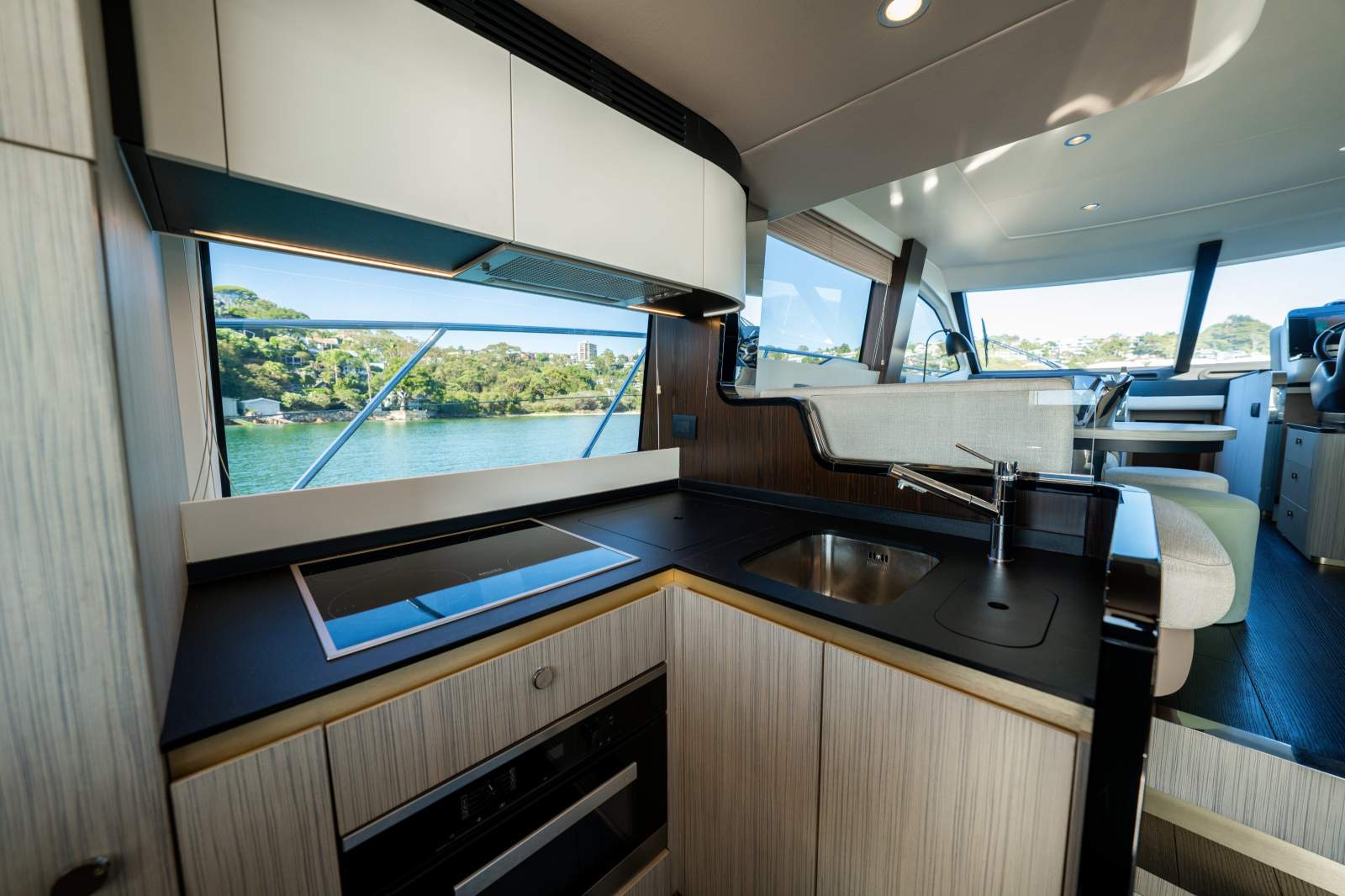 Galley: With a neat curved return (naturally), the galley is well placed to serve both internal and external deck spaces and the raised dinette amidships with settee opposite is sociably arranged and in the best position to drink in the elevated views. Of course, with all high-end appliances.