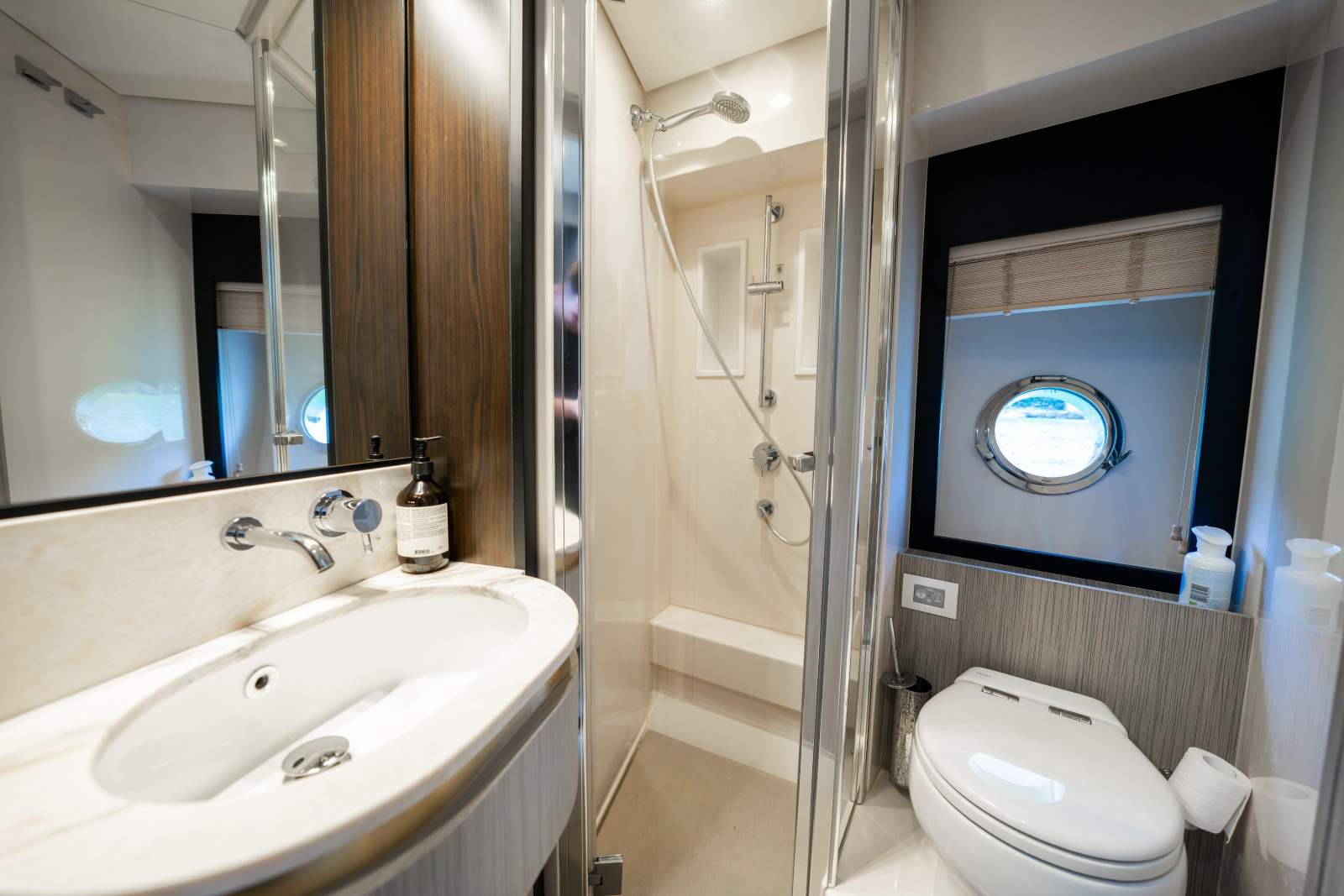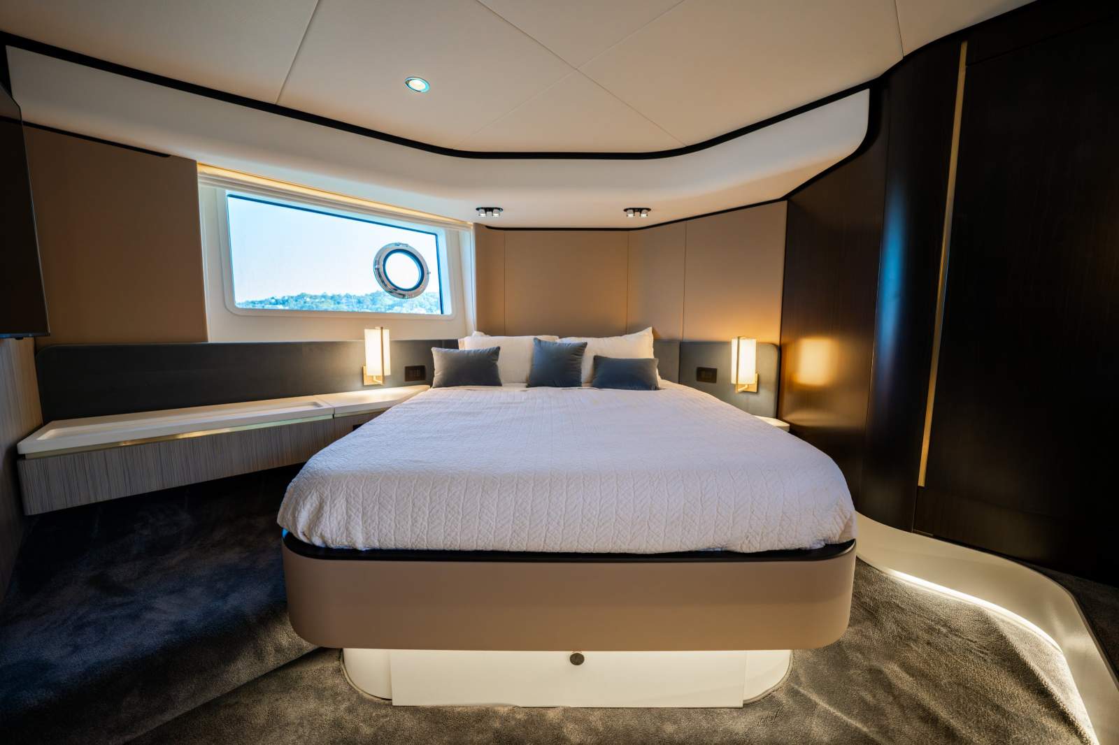 Accomodation: Below decks the layout and décor are no less intriguing, especially in the master cabin, which has an angled island berth and a host of delightful styling cues that are more reminiscent of an upmarket hotel suite than a boat's cabin. Again, the texture and colour choices are rich and varied and the lamps are statement pieces in themselves. With a forward VIP cabin in the same vein, along with two side-by-side singles to stbd
