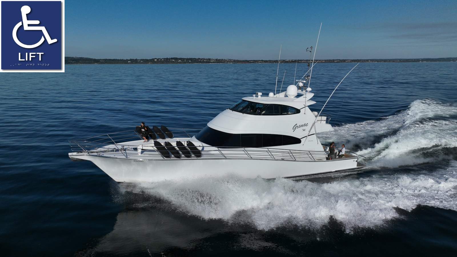 Wheelchair Accessible Sportfishing Excellence: As a top-tier sportfishing boat, she comes equipped with a spacious cockpit, all essential fishing amenities, and wide-open decks. With her wheelchair-accessible layout, including an aquatic lift and elevator, she stands out among fishing expedition boats for her versatility and inclusivity.