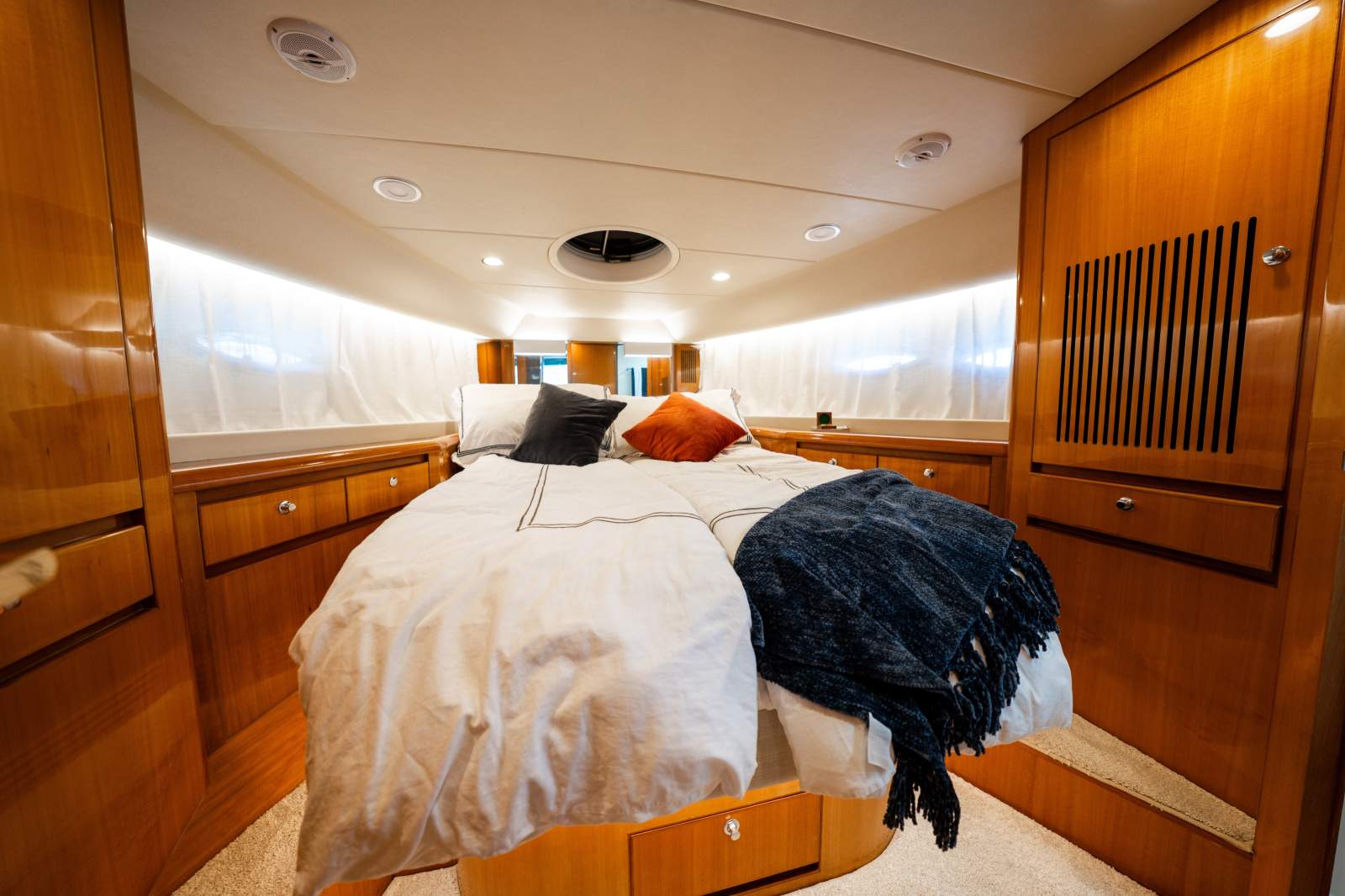 Accomodation: Forward master cabin with island bed and ensuite, Guest twin cabin to starboard.