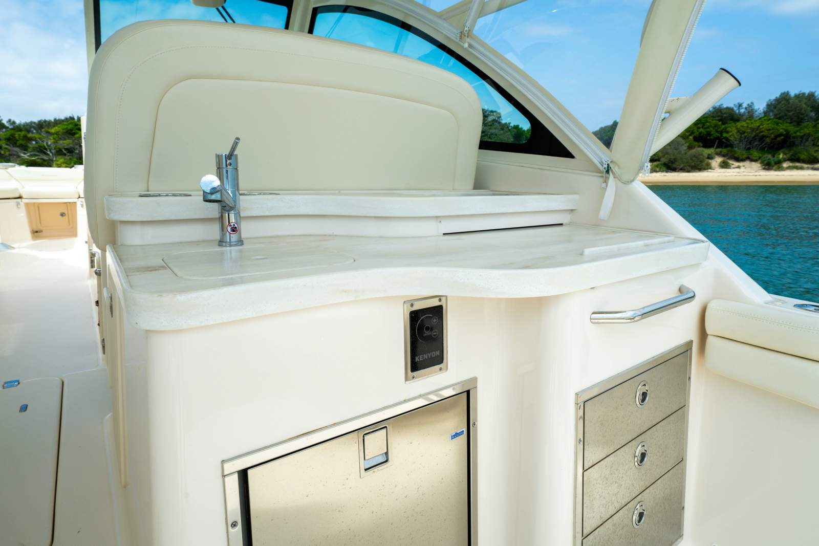 Galley: The galley sits to port in the main cockpit, built into a solid moulded module that feels more like a mini outdoor kitchen than a token wet bar. Grady uses wide counters, deep storage, and stainless hardware so everything feels durable and ready for real use. Because it's in the open cockpit rather than down below, it becomes a natural gathering point when entertaining.