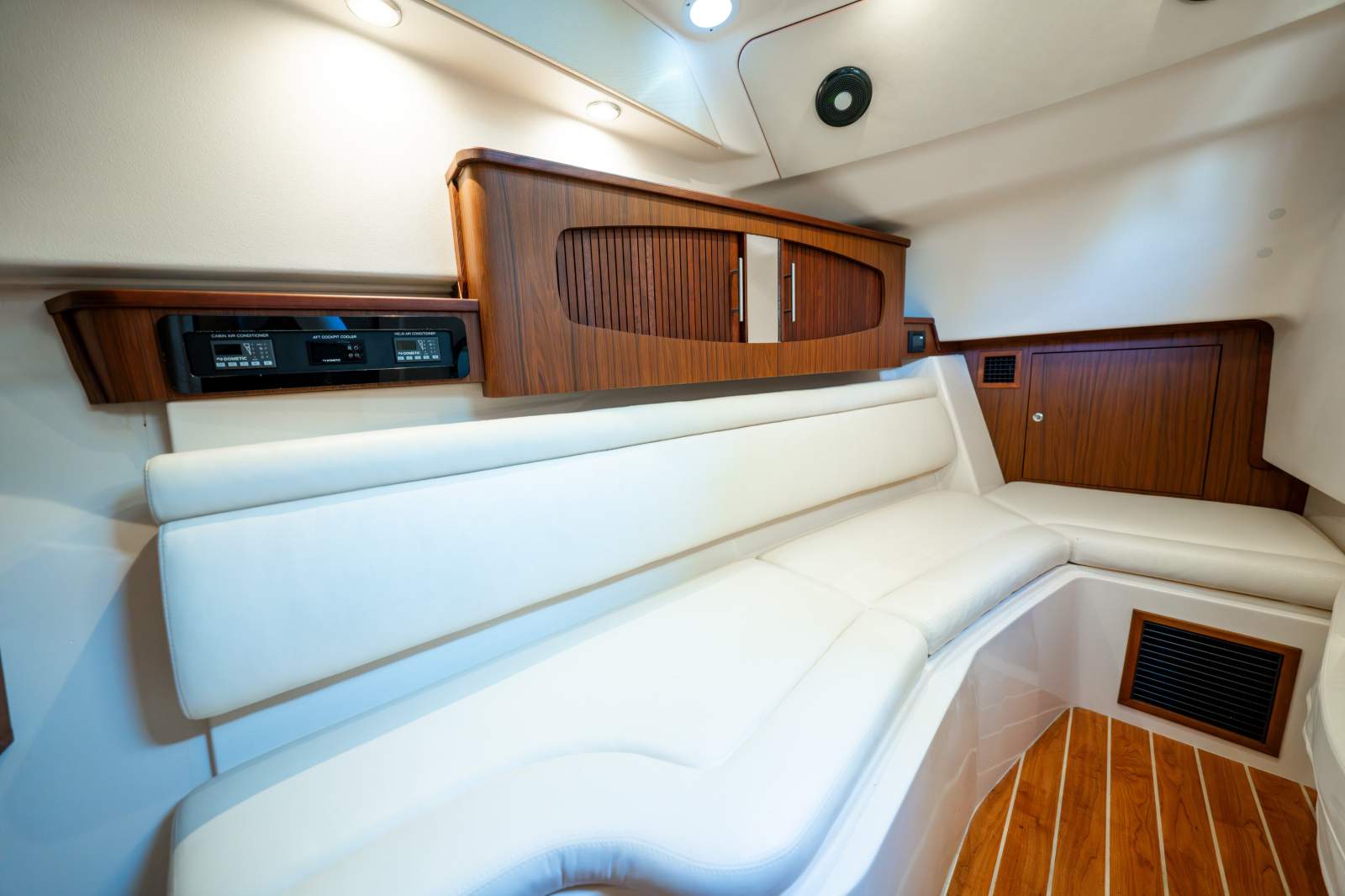 Accomodation: The accommodations are split between an under-console living space to port, and a multifunction head compartment to starboard. Three steps down to port, and forward of you is a settee that can convert into a berth with the help of an infill cushion.