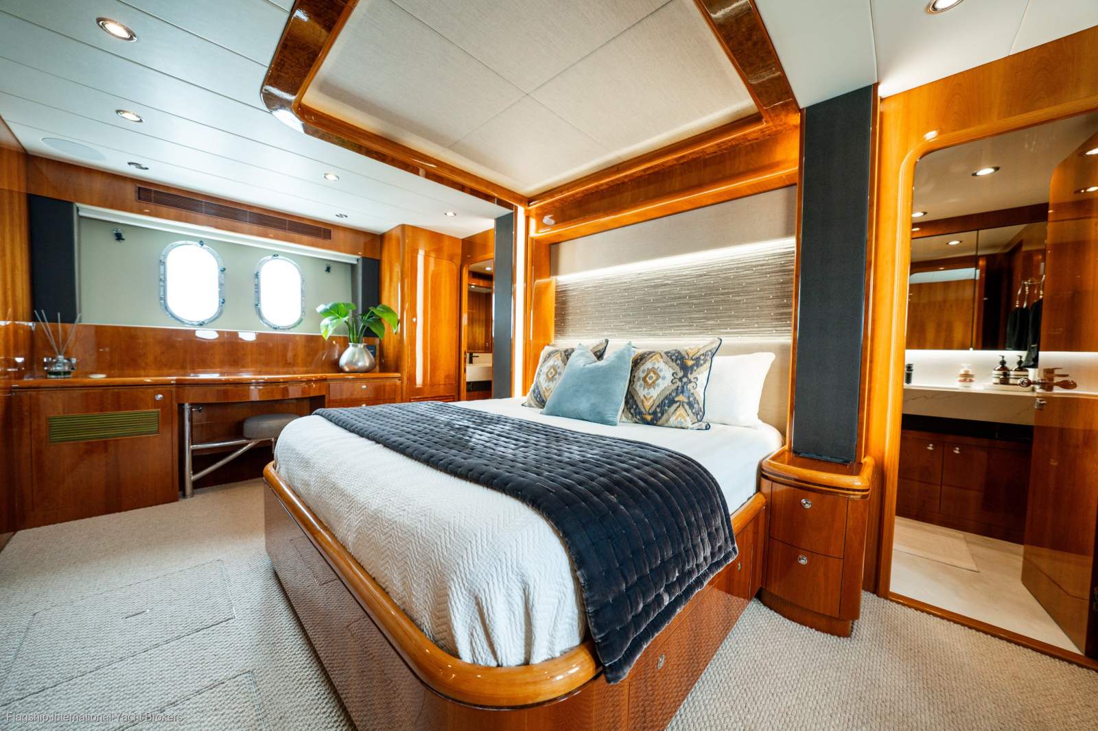 Step aboard via the vast teak-laid hydraulic swim platform to discover various expansive alfresco spaces all perfectly equipped for entertaining. Moving through the saloon it is striking with gorgeous high-gloss cherrywood timbers, layers of fabric textures, plush lounges and all enhanced by the panoramic picture windows, beyond is the stunning formal dining area which then leads to the exceptional and expansive gourmet galley fully equipped with high-end appliances and finishes and incorporates the casual country kitchen style dining area.