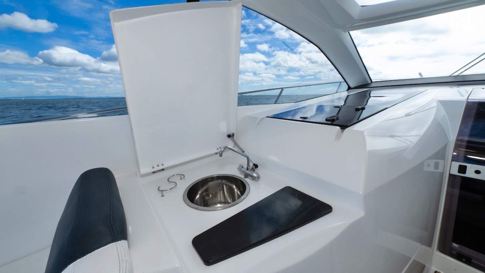 A very stylish design that provides the perfect entertaining area on the main deck, she also offers an air-conditioned sanctuary down below where you'll find the galley, a large dinette, two luxurious sleeping cabins and a roomy bathroom.