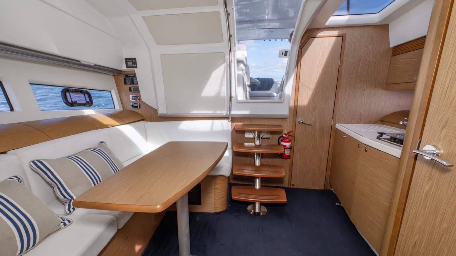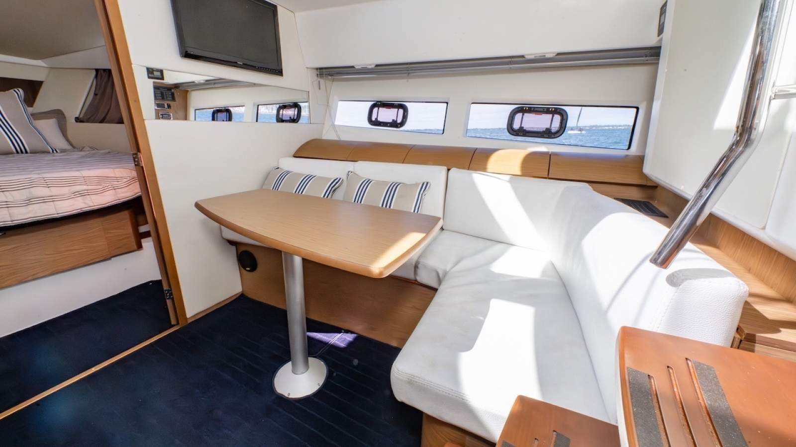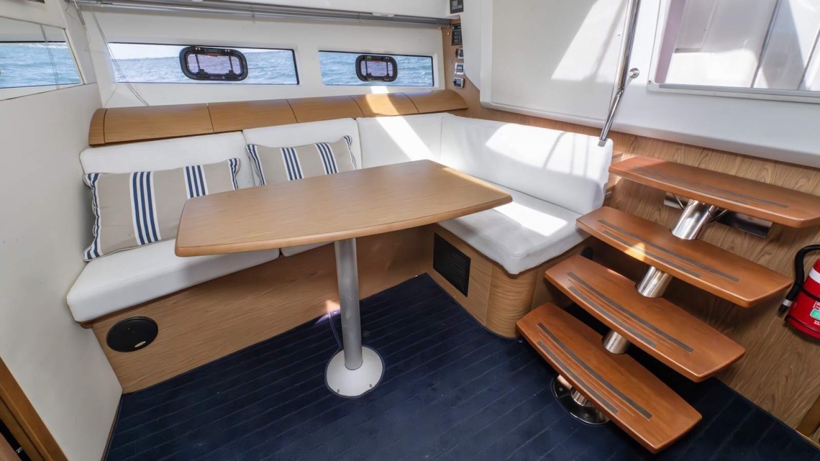 The cockpit area easily accommodates between six to eight guests with U-shaped seating around a large table for the ultimate waterfront dining experience. There is also a dinette in the lower cabin that offers better protection when the weather is less friendly.
