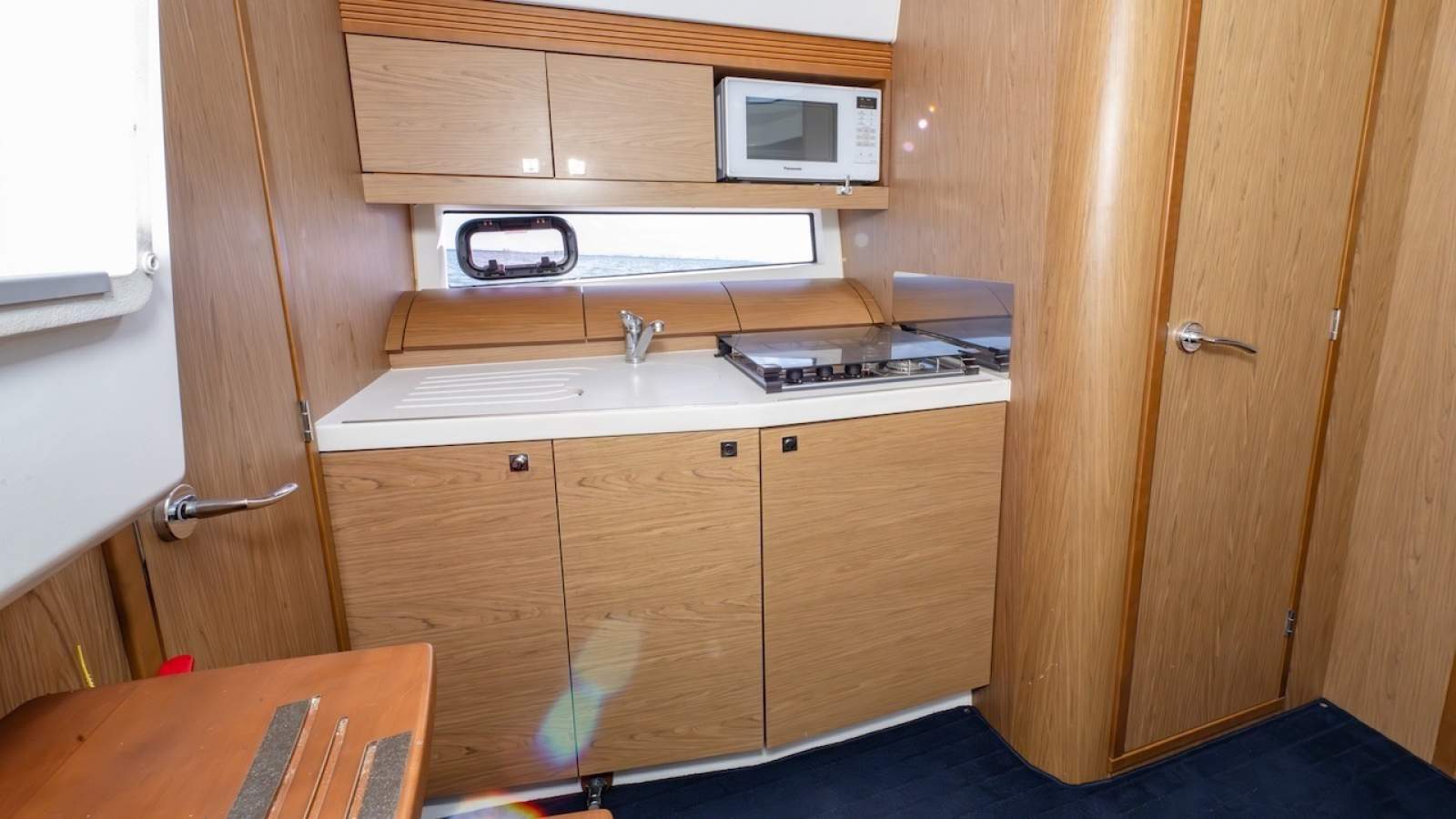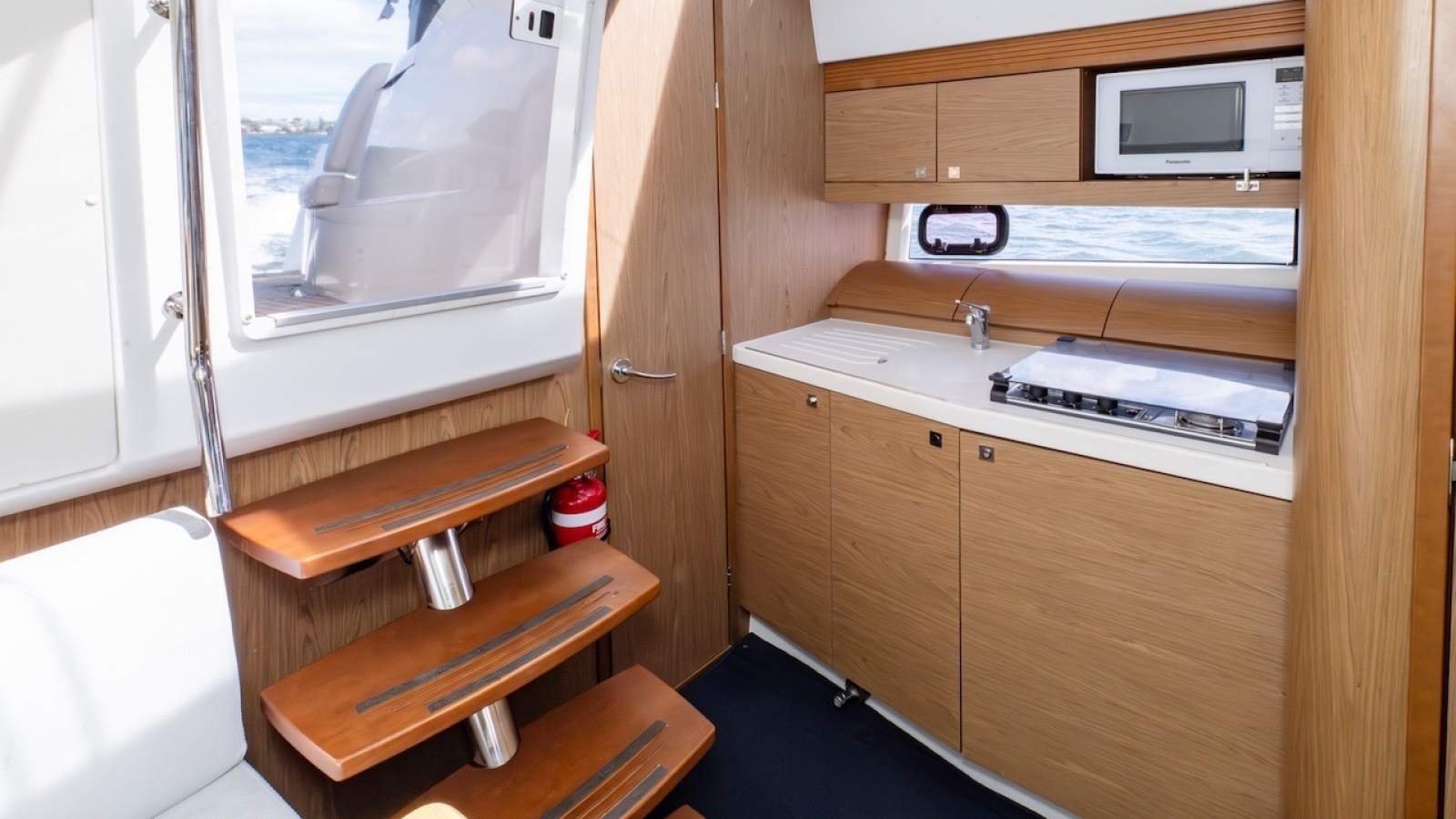 Galley: Linear layout with sink and cupboards, Eno 3-burner LPG cooktop, Panasonic NN-ST25JW microwave, Waeco CR-0080 underbench fridge / freezer.