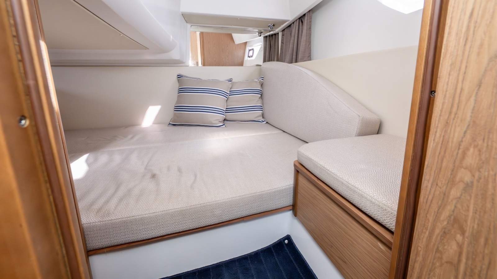 The layout down below offers two double cabins complete with doors for privacy, a bathroom on the starboard side and a galley opposite - all trimmed with light timber. There's hanging lockers and storage in each cabin too.