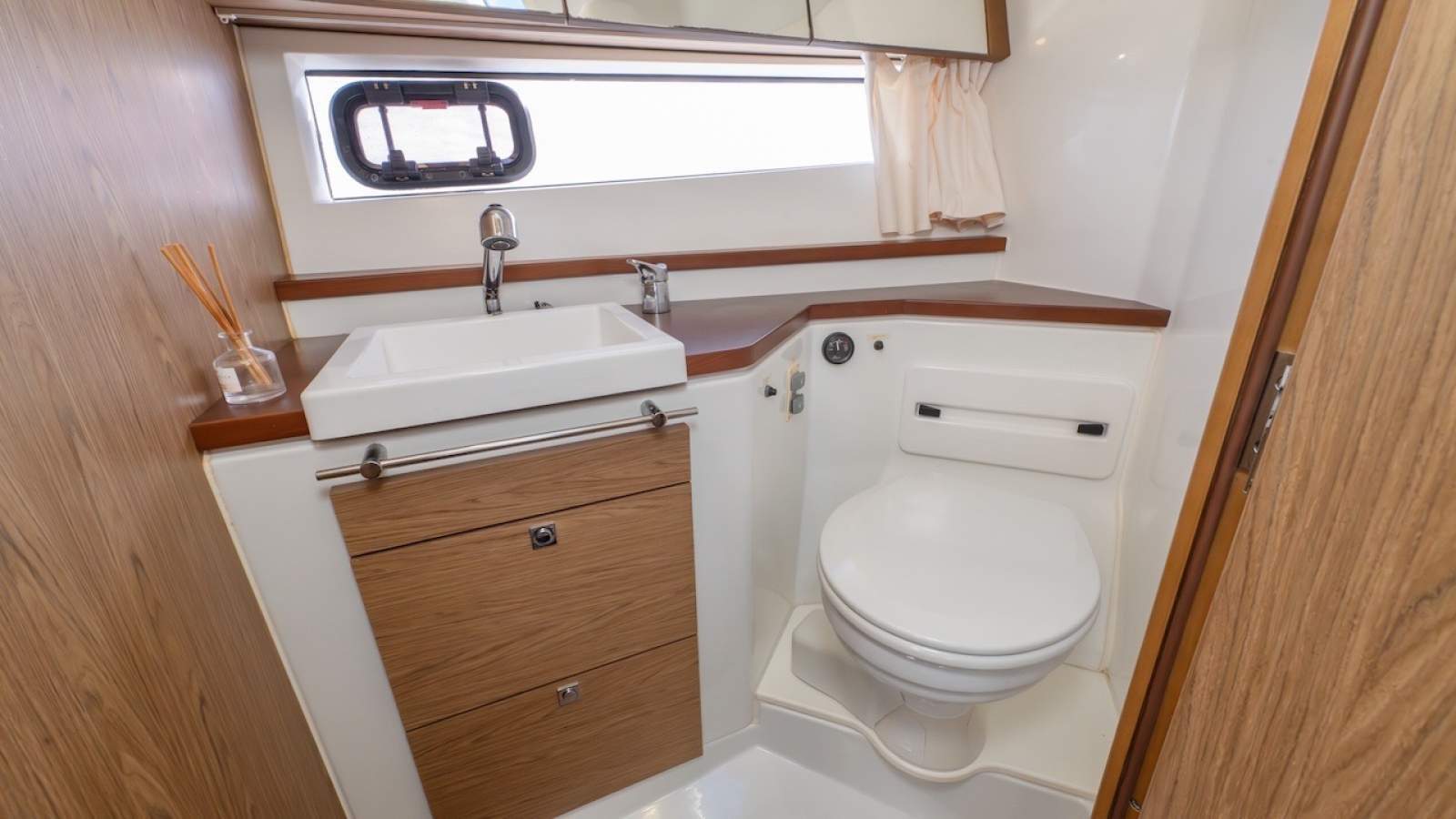Accomodation: Two cabin layout on the lower deck with a single bathroom providing a shower enclosure and electric toilet with a holding tank. Galley is to port side and a dinette is to starboard.