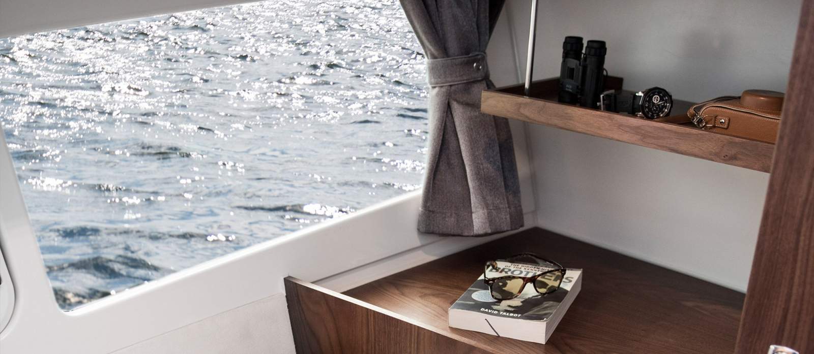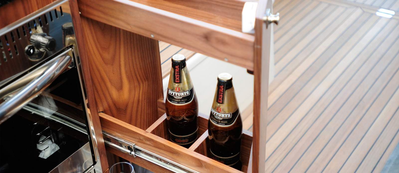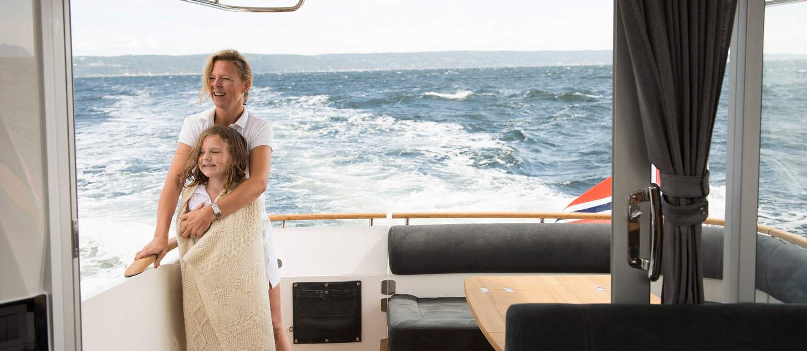 Covers over the cooktop and wooden boards on the sink, double the useful space on the galley's compact countertop. Also, owners can use optional solar panels mounted on a roof to power the fridge and other equipment when away from shore power. Comfort in the spacious forward or midship cabin with its extra sofa allows guests to relax onthe lower deck. With a double bed, wardrobes and huge storage areas in both cabins, time herewith loved ones will be unforgettable. The separate shower with bench increases the 375's homely feeling too.