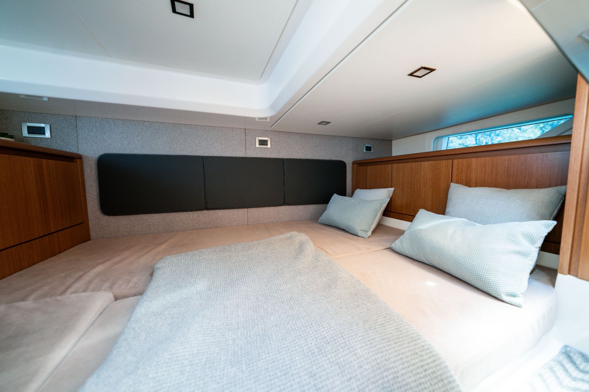 The Schaefer 375 features comfortable aft and forward berths, designed to sleep four people. The forward berth offers a spacious V-shaped bed, while the aft berth provides a cozy and private sleeping area, both equipped with ample storage.