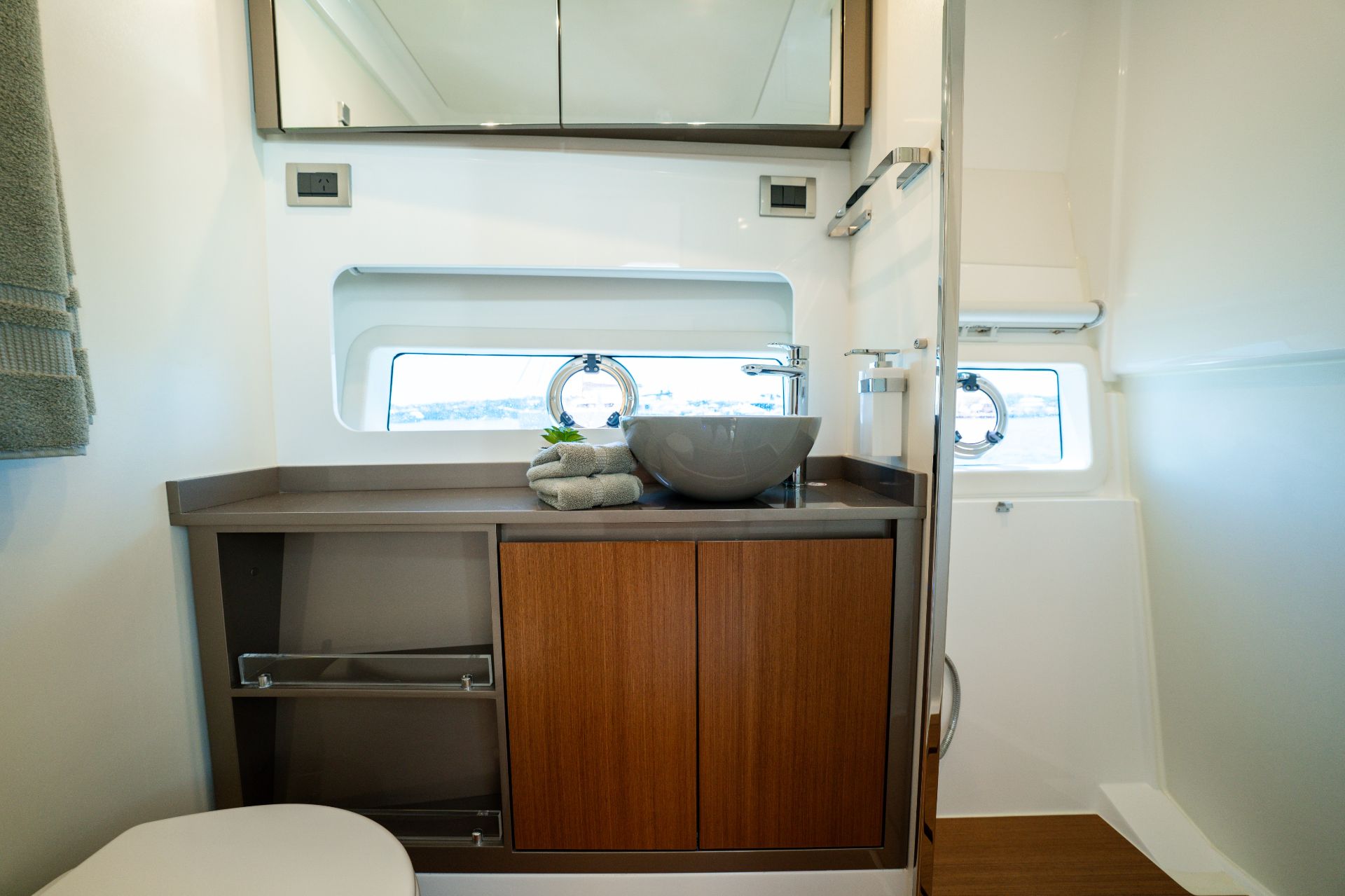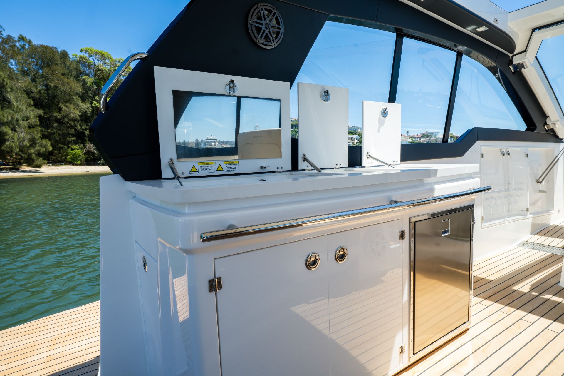Galley with ample storage, microwave and sink electric grill in cockpit