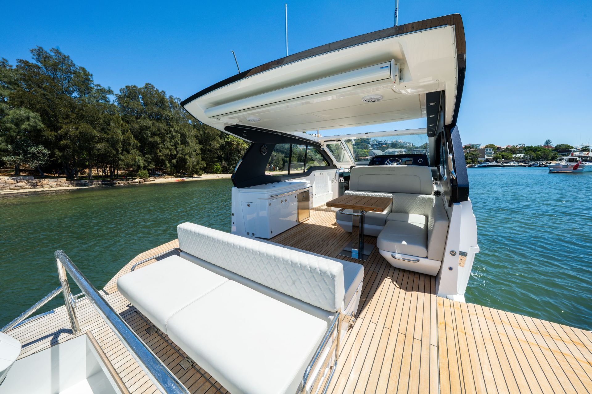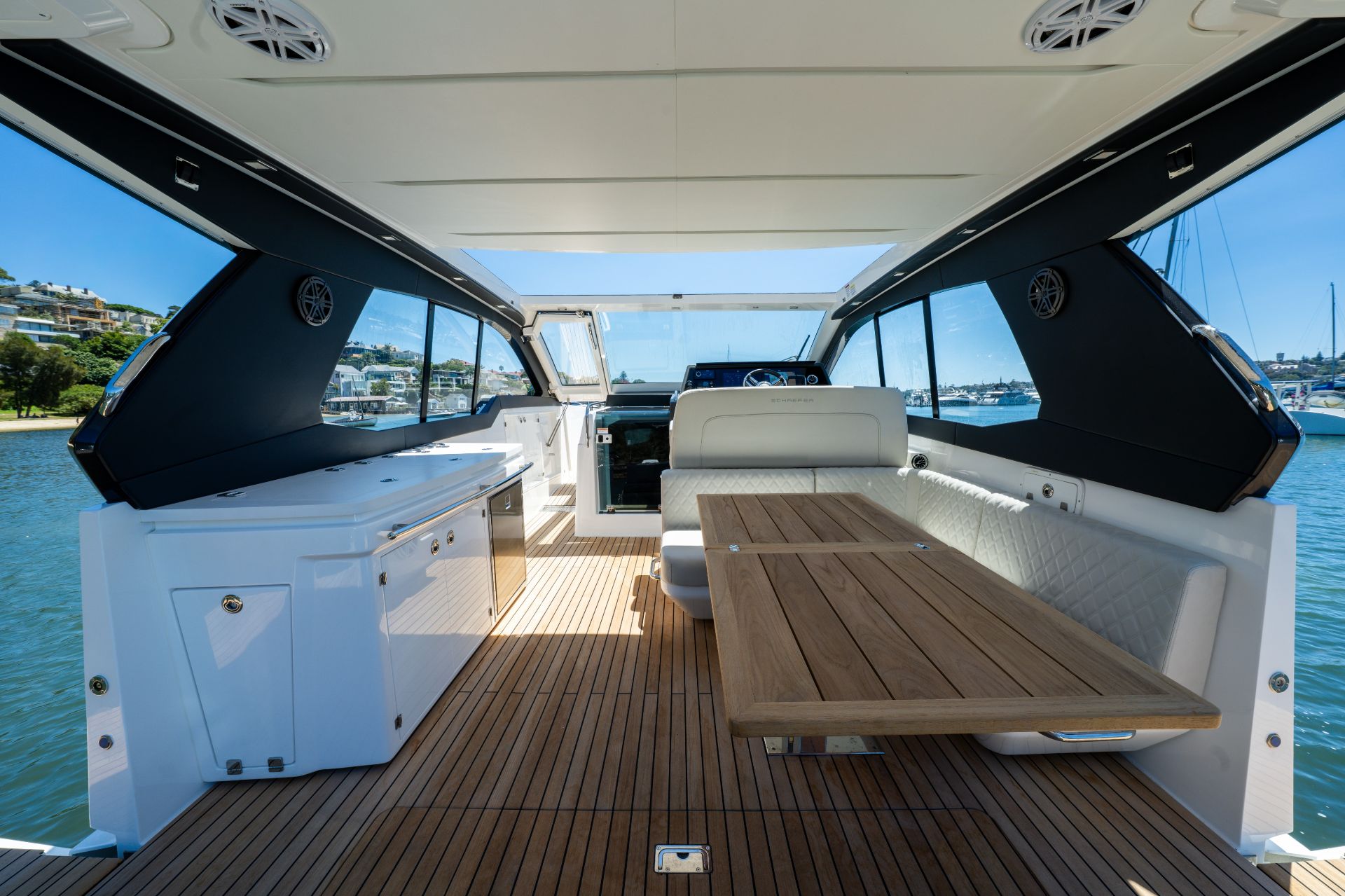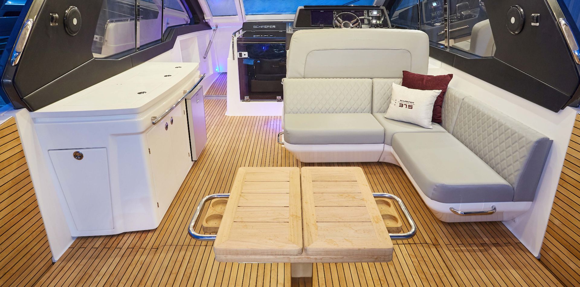 The Schaefer 375 can comfortably fit up to 14 people during the day and 4 overnight. Whether you're planning a day out with friends or a family getaway, this boat has got you covered. The flexible deck layouts let you choose between a gourmet station with a grill at the stern or a sunpad/bench seating. The drop-down balconies, which come standard on this model, significantly expand your space for relaxing and entertaining, making the boat feel much larger than it is.
