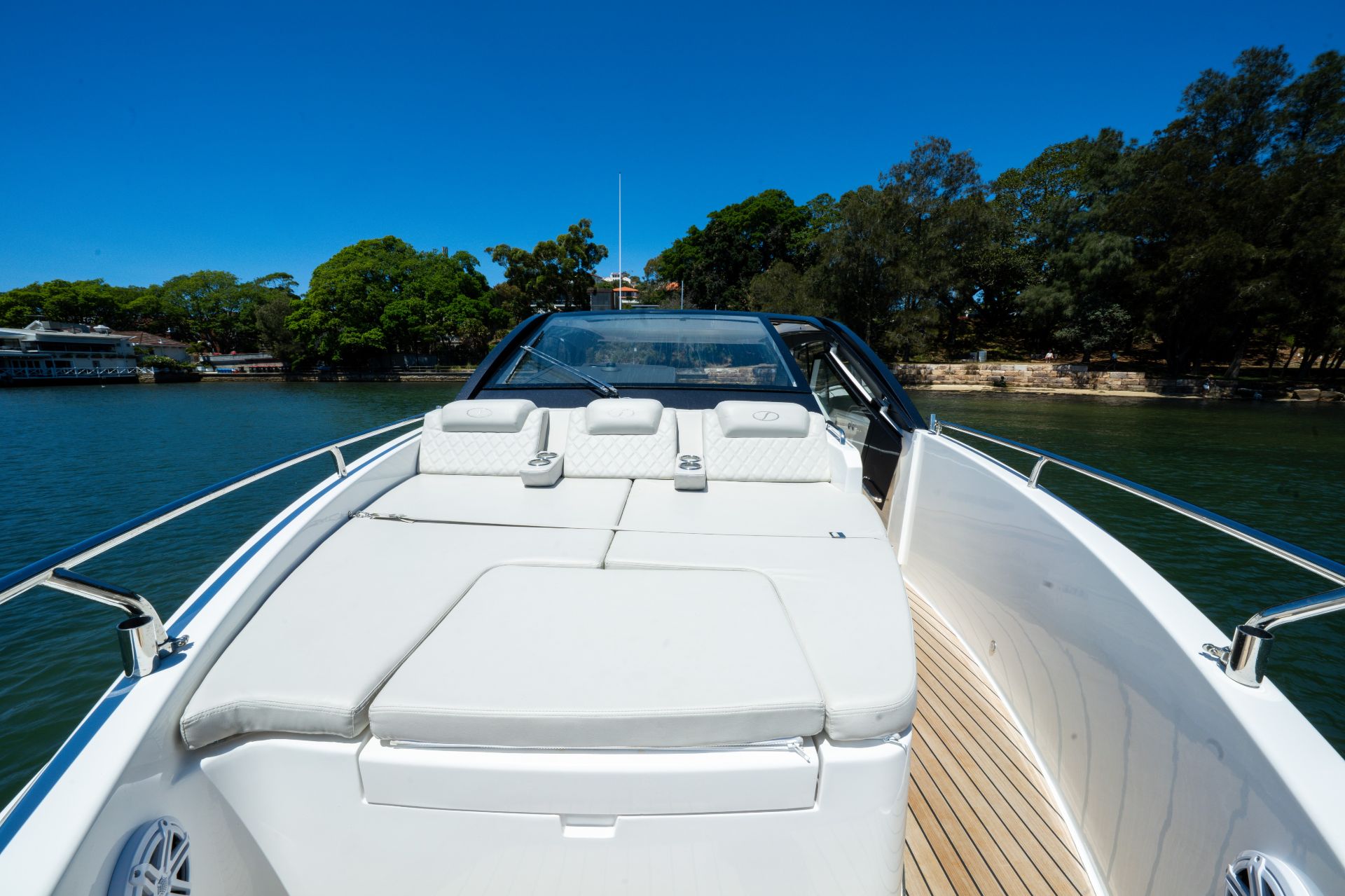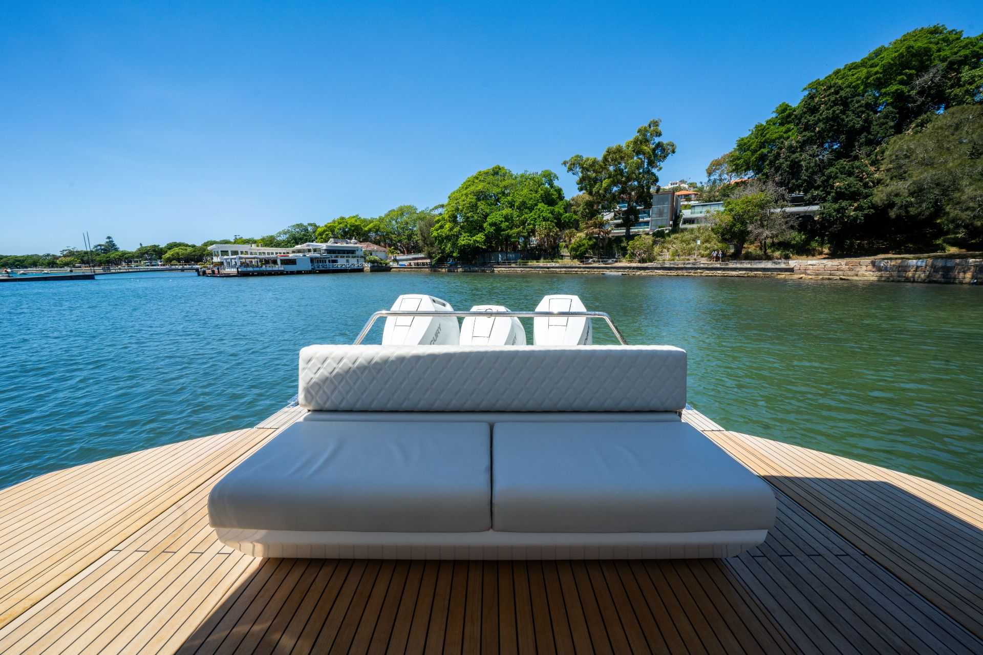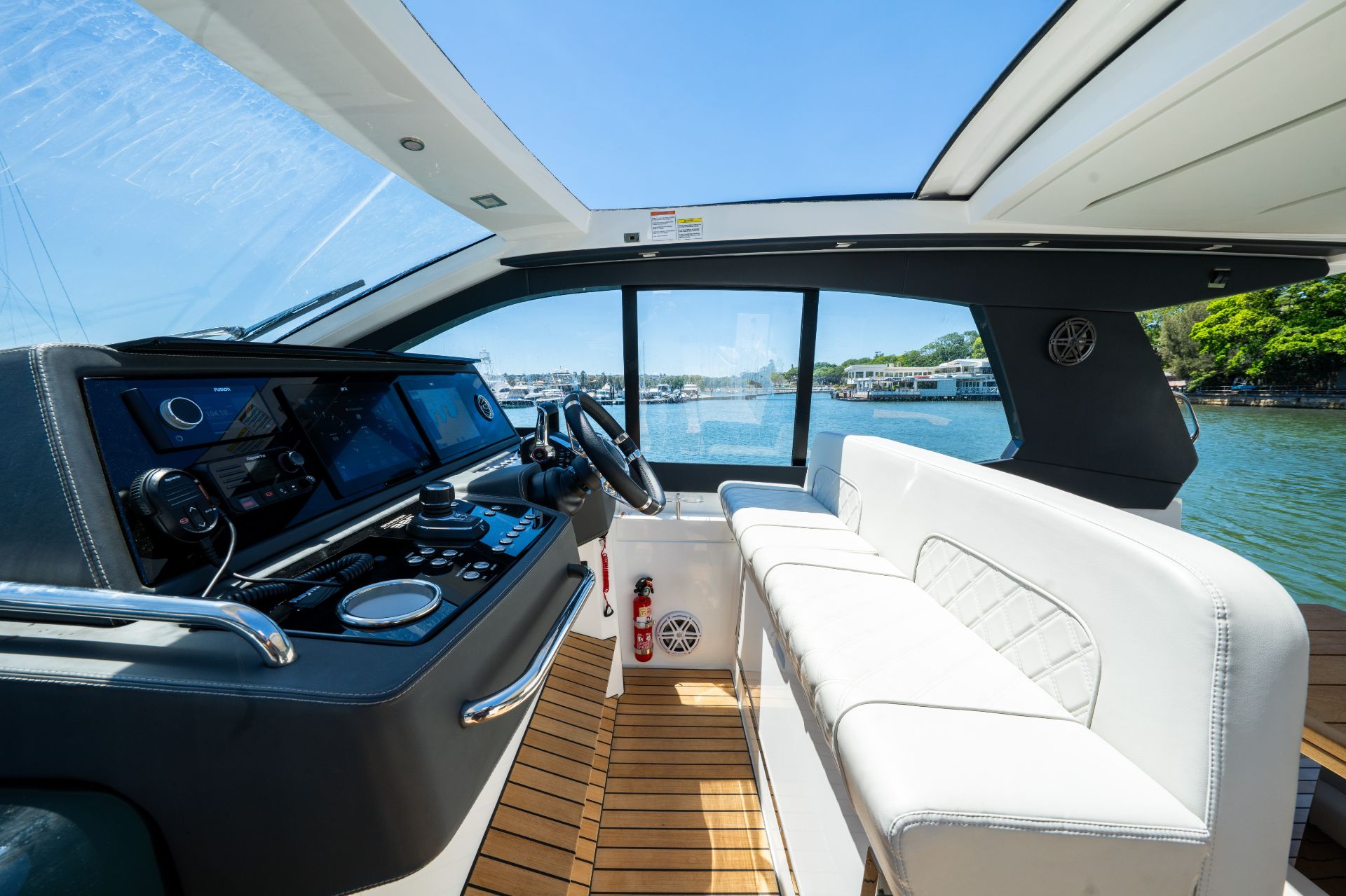 The Schaefer 375 can comfortably fit up to 14 people during the day and 4 overnight. Whether you're planning a day out with friends or a family getaway, this boat has got you covered. The flexible deck layouts let you choose between a gourmet station with a grill at the stern or a sunpad/bench seating. The drop-down balconies, which come standard on this model, significantly expand your space for relaxing and entertaining, making the boat feel much larger than it is.