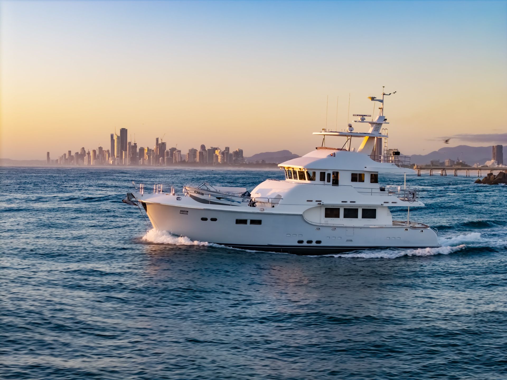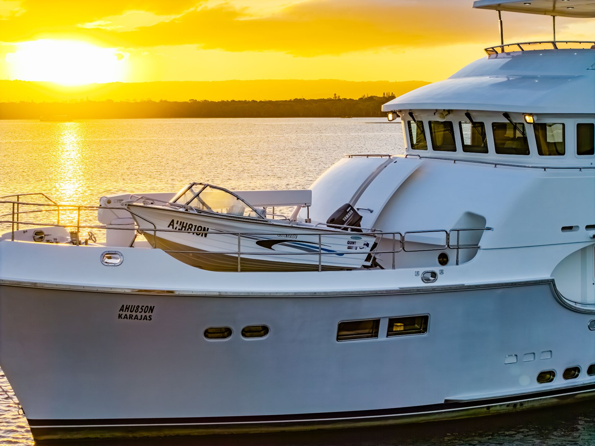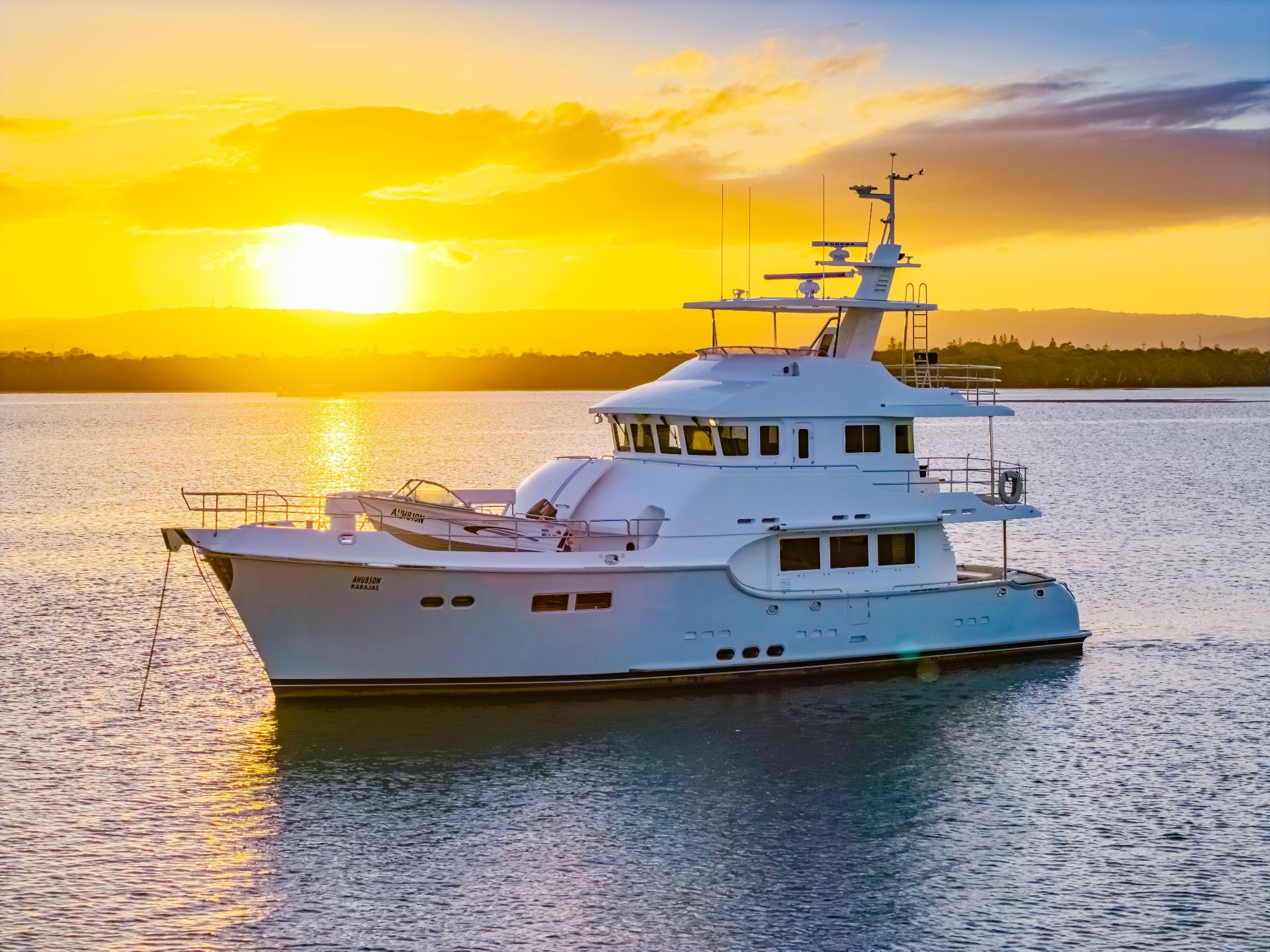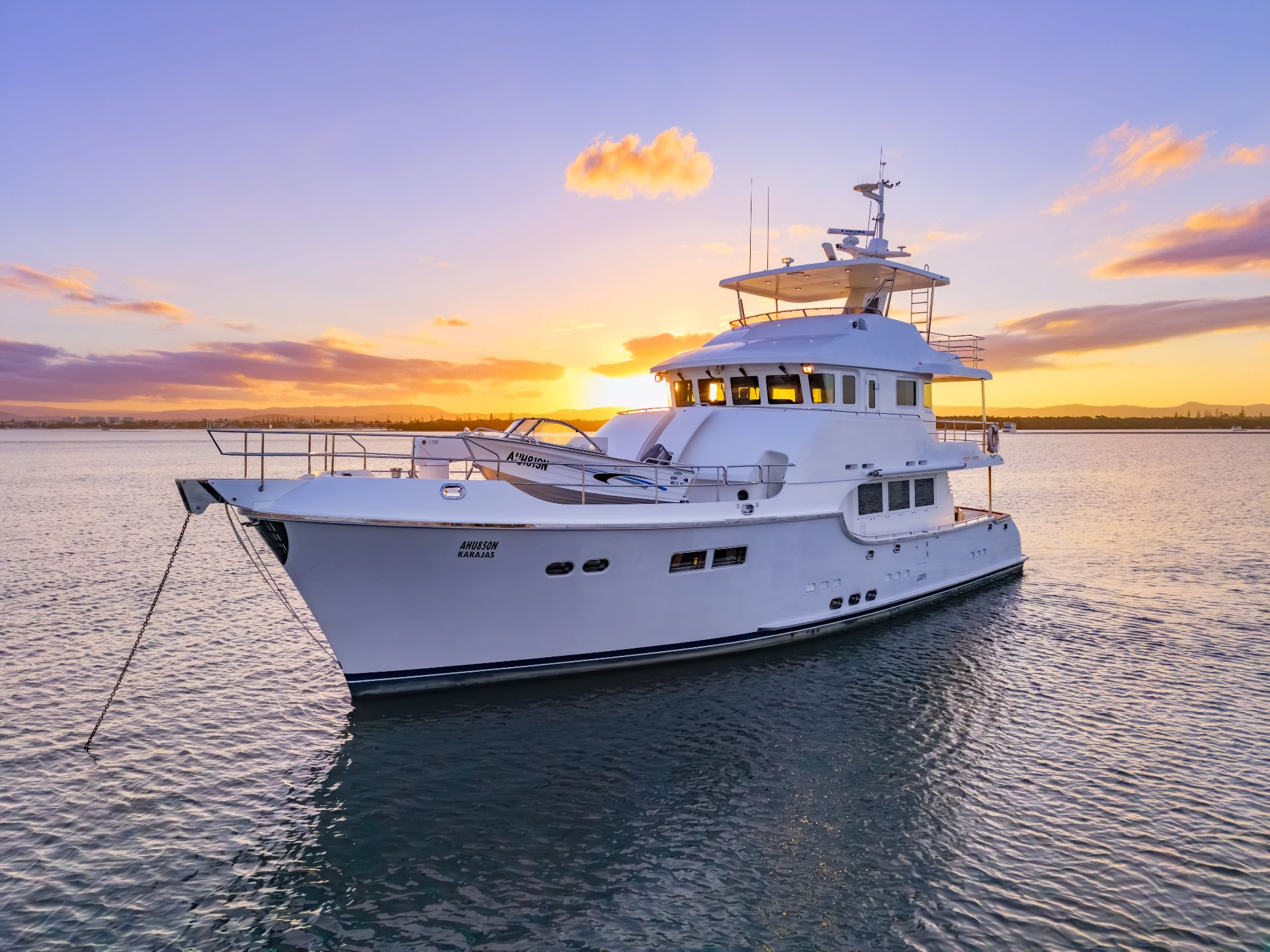 Delivered new to Australia and still under the care of her original owners, Karajas (Hull #25) was conceived from day one as a quiet, reliable and highly autonomous passagemaker. Her brief resulted in a CE-marked build, 230V/50Hz electrical specification, whilst with the ability to accept 60 Hz, a deeply upgraded engineering platform, and one of the most refined custom interiors ever created on a Nordhavn 68, personally designed with interior architect Scott Cole and finished in satin-stained mahogany, marble and premium stainless accents.