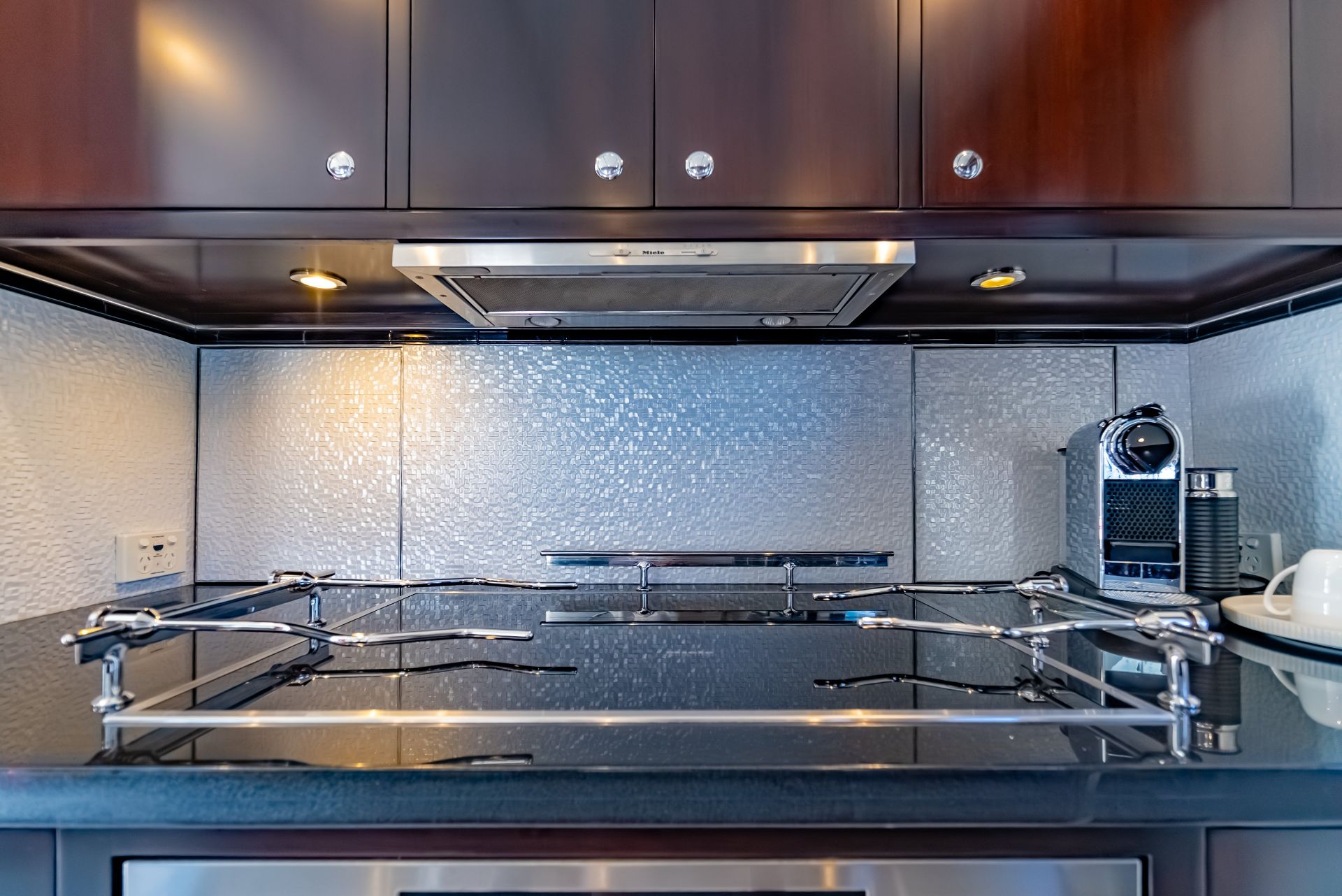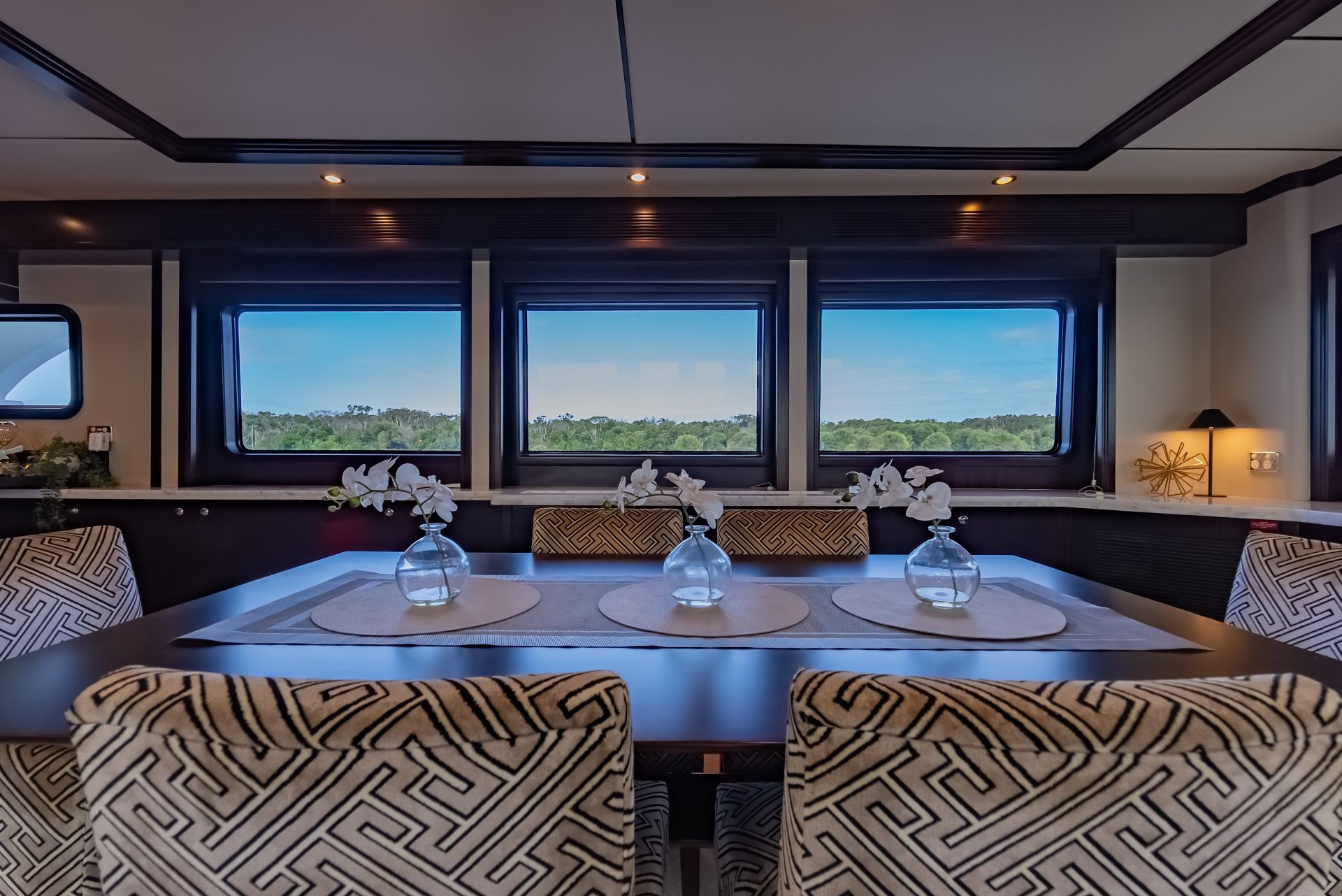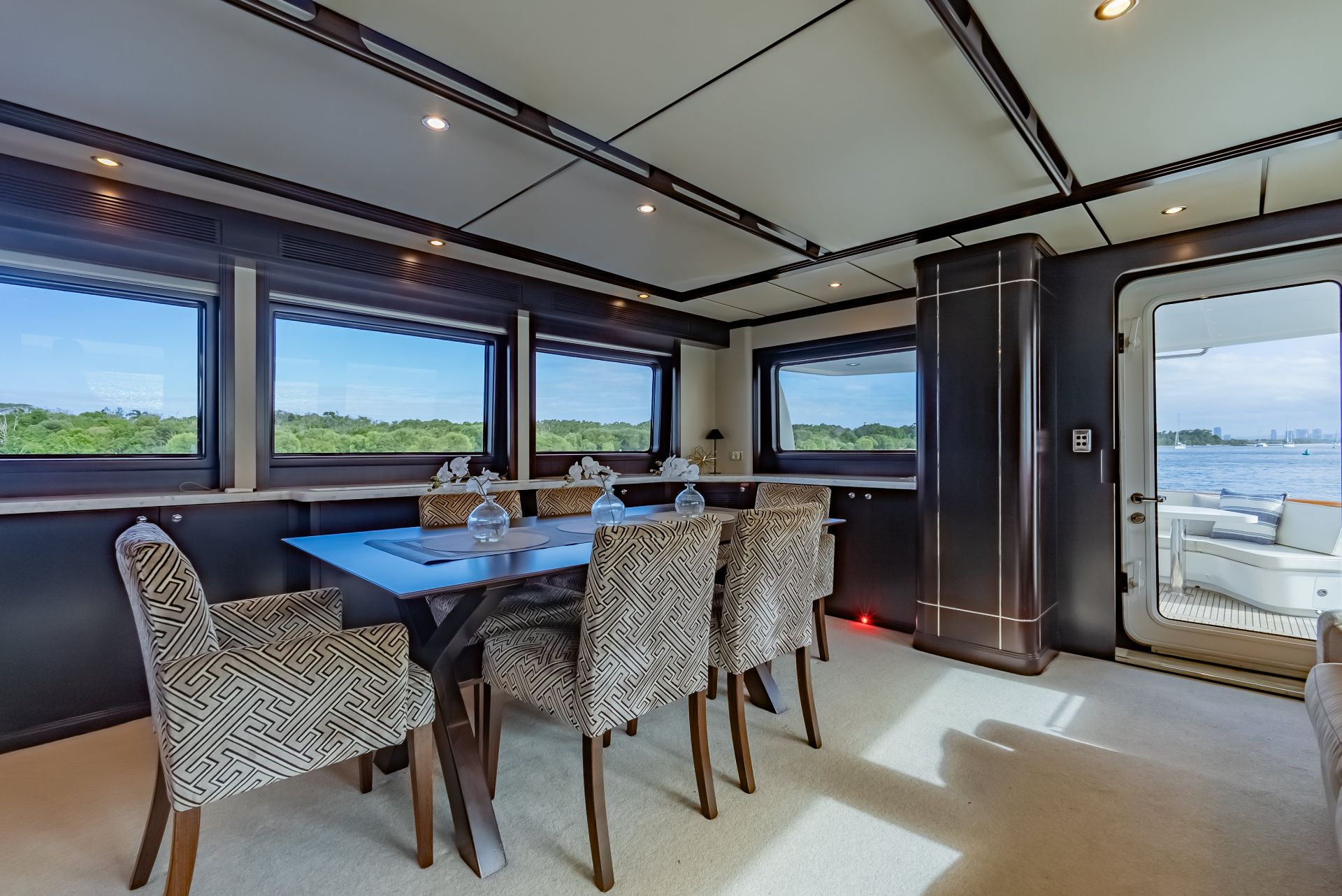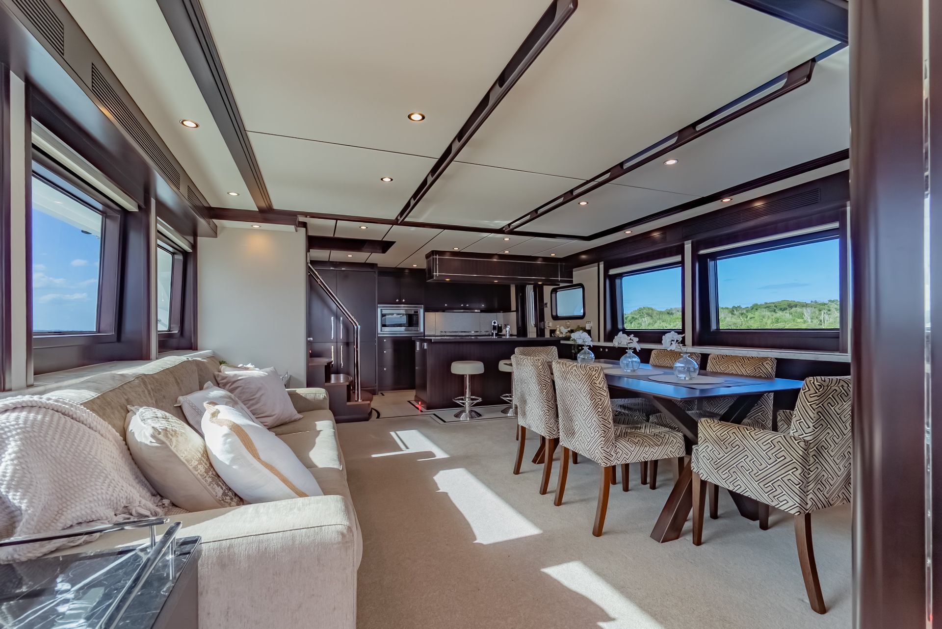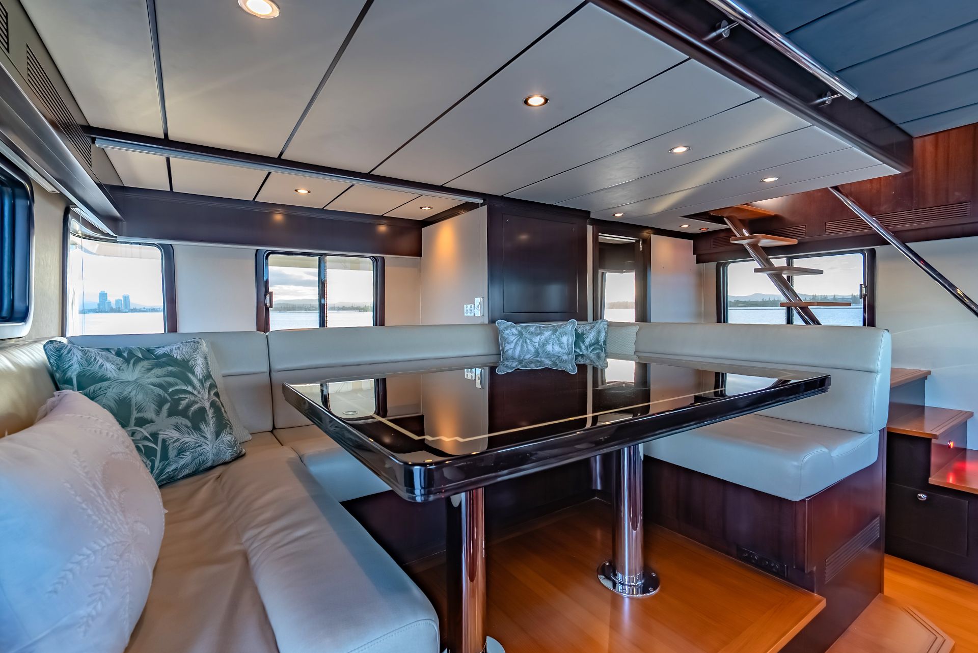 A warm and modern interior with satin-stained mahogany, stainless steel accents, stone and marble surfaces, and premium lighting and joinery. The interior was a significant, architect-driven upgrade from the standard Nordhavn specification.