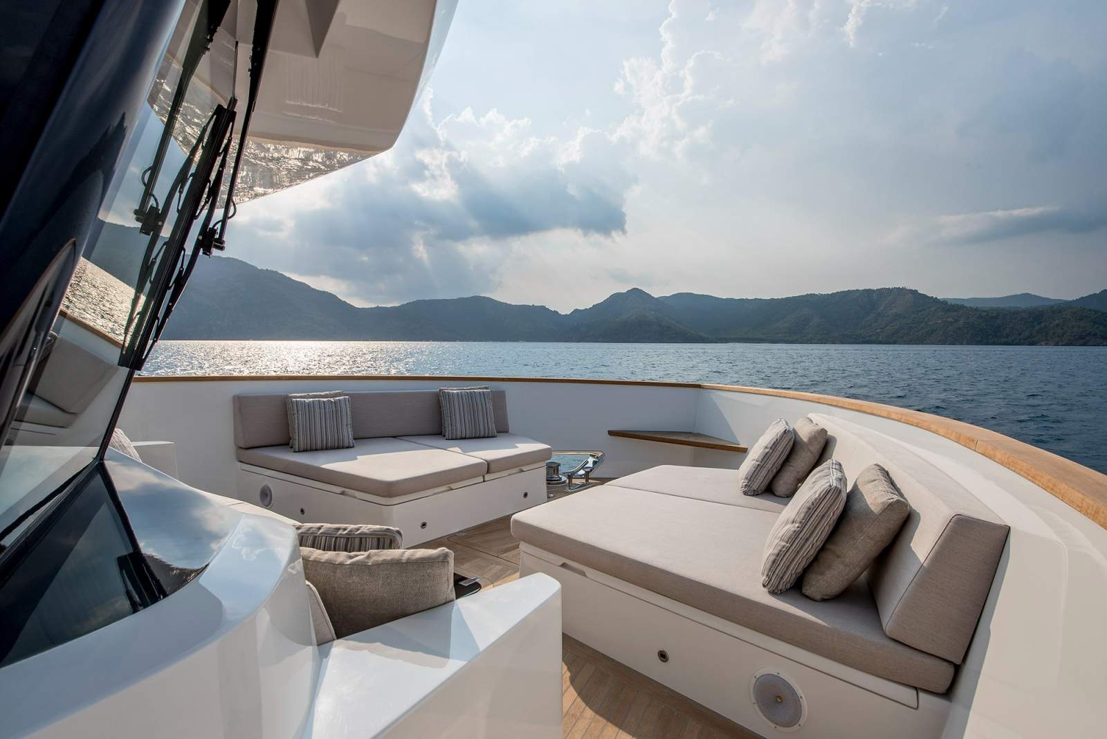 Every area of the 27XP is shaped around openness and natural light. Panoramic picture windows frame ocean views, immersing guests in the seascape. The saloon, with aft and side-opening doors, flows seamlessly into outdoor living. Layouts are versatile; owners may select a main deck VIP suite, creating a five-cabin arrangement. The full-beam Master suite below oers a walk-in closet, spacious bathroom, and an atmosphere of indulgence. The yacht excels in open-air living. The raised bow lounge oers uninterrupted horizons, while the supersized flybridge is ideal for entertaining or relaxing under the sun. A new expanded sunbed above the helm invites long, leisurely afternoons.