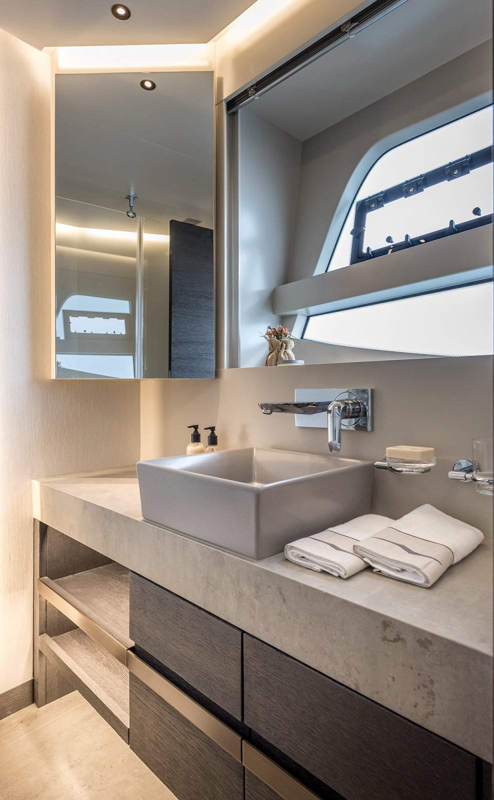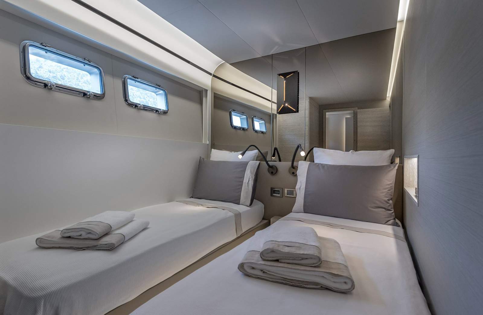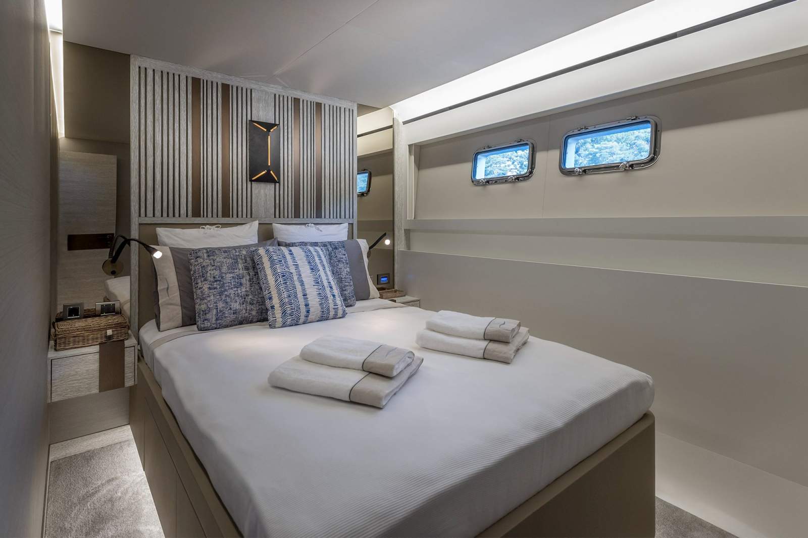 Accomodation: The 27XP offers up to five guest cabins plus separate crew quarters. The full-beam master cabin amidships features a diagonal bed, large windows and a spacious en-suite. Flexible layouts provide four or five en-suite guest cabins finished with premium materials, accommodating eight or ten guests. Crew quarters forward include two twin cabins and a private captain's cabin. Saloon and dining spaces are generous and light, and all cabins have contemporary en-suite bathrooms.