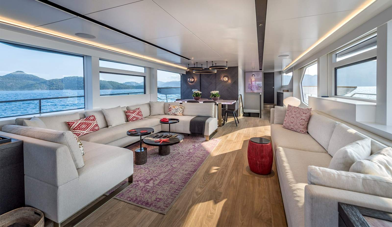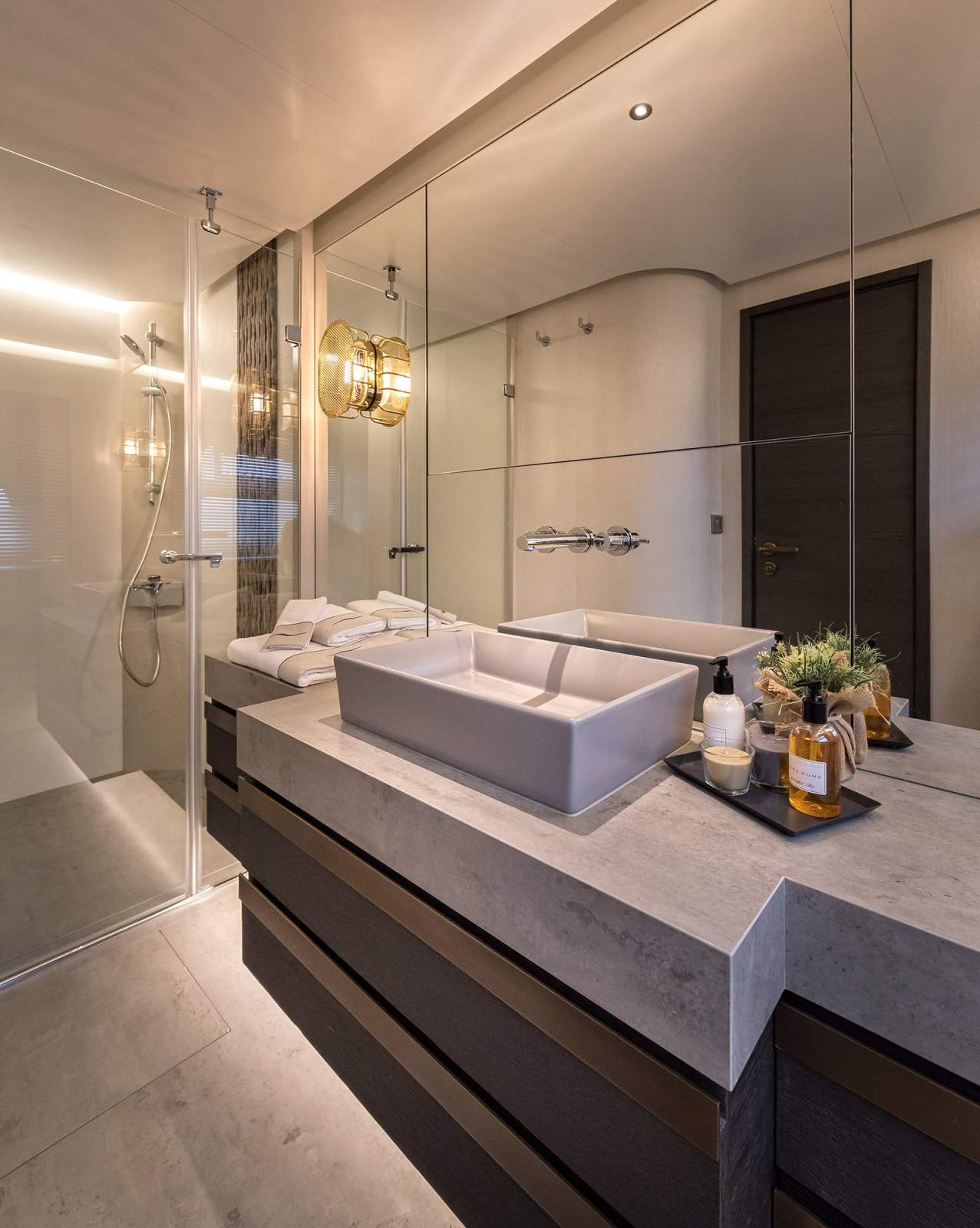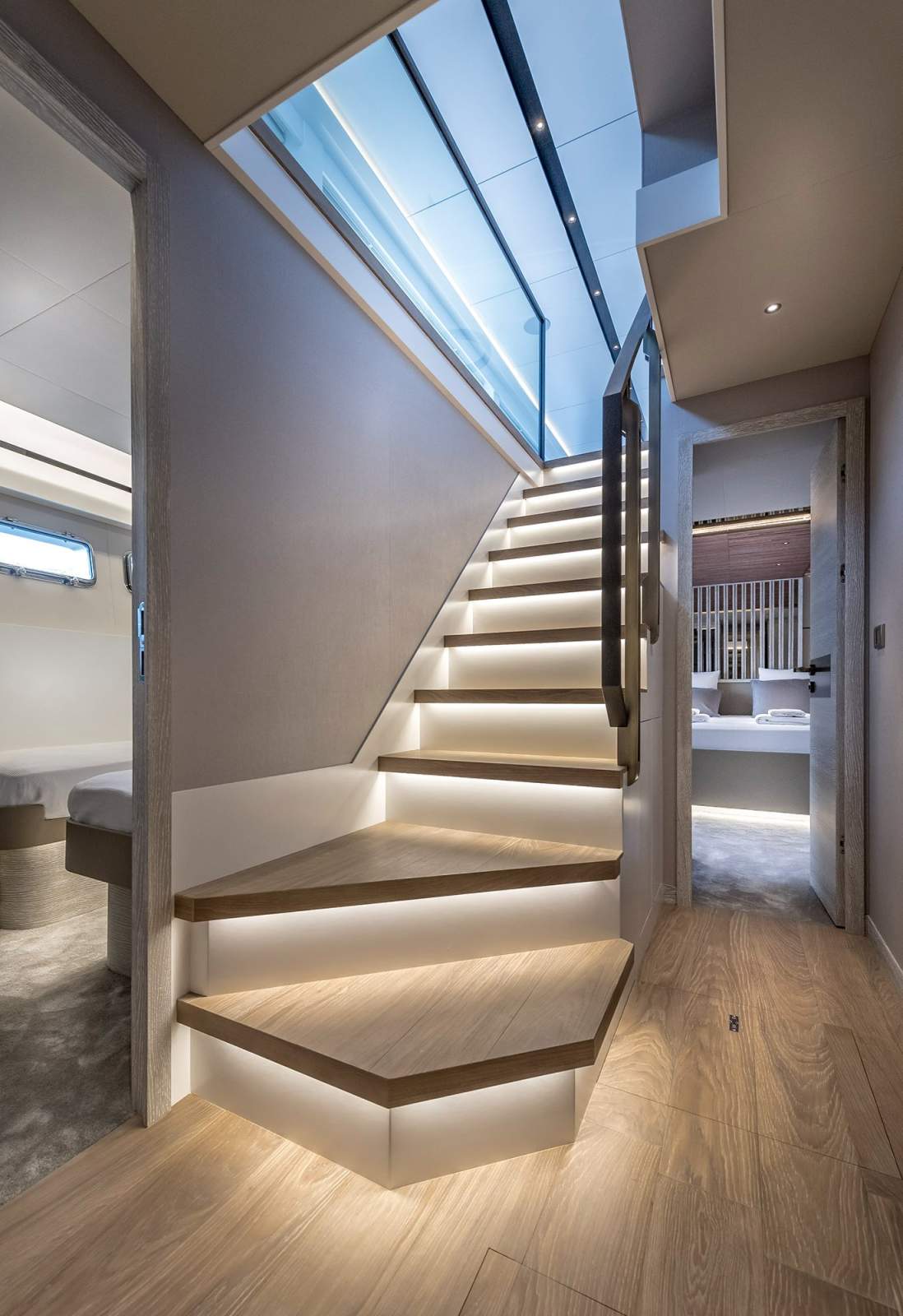 Accomodation: The 27XP offers up to five guest cabins plus separate crew quarters. The full-beam master cabin amidships features a diagonal bed, large windows and a spacious en-suite. Flexible layouts provide four or five en-suite guest cabins finished with premium materials, accommodating eight or ten guests. Crew quarters forward include two twin cabins and a private captain's cabin. Saloon and dining spaces are generous and light, and all cabins have contemporary en-suite bathrooms.