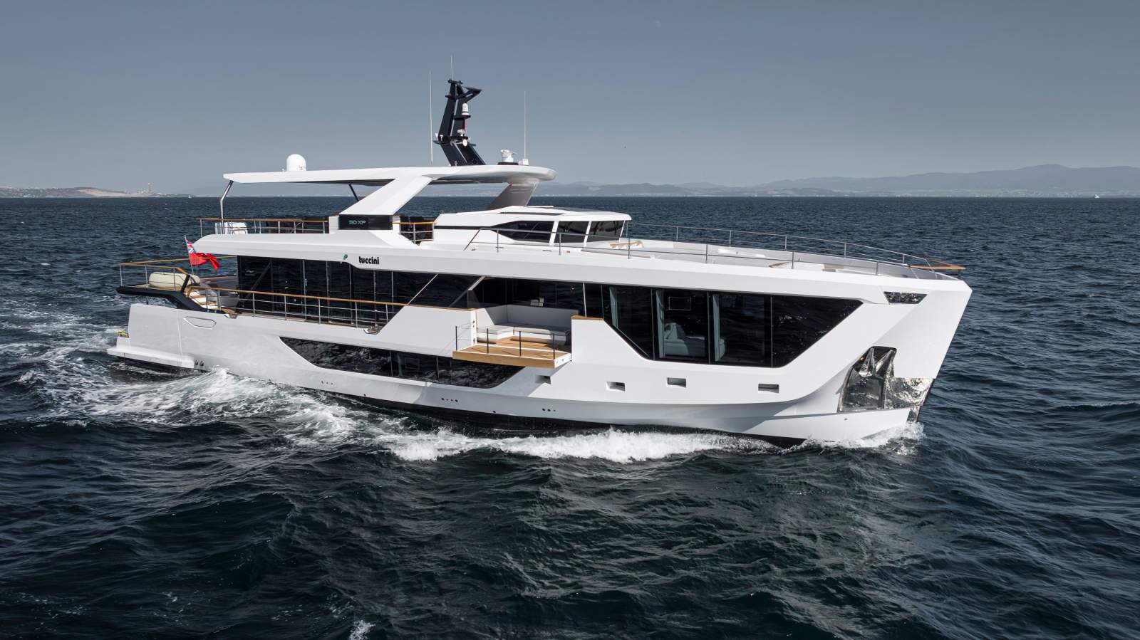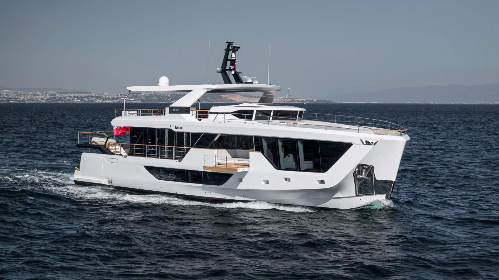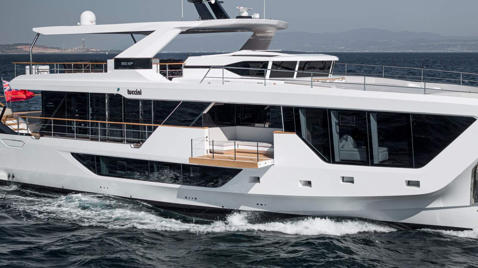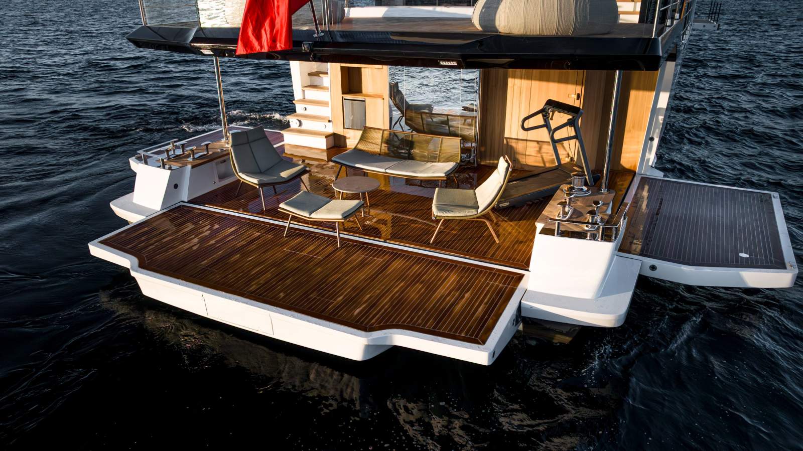 Expansive outdoor spaces are a hallmark of the 30XP. The aft beach club opens on three sides to create a waterside lounge that connects seamlessly to the sea. Forward, generous seating and sunpads invite you to relax at anchor, while the flybridge provides shaded lounging and entertaining space. Inside, the saloon is framed by panoramic windows and sliding doors that bathe the interior in natural light, and a main-deck owner's suite offers floor-to-ceiling glazing and a private ensuite. Four guest cabins on the lower deck accommodate up to eight guests, and crew quarters forward house the captain and four crew.