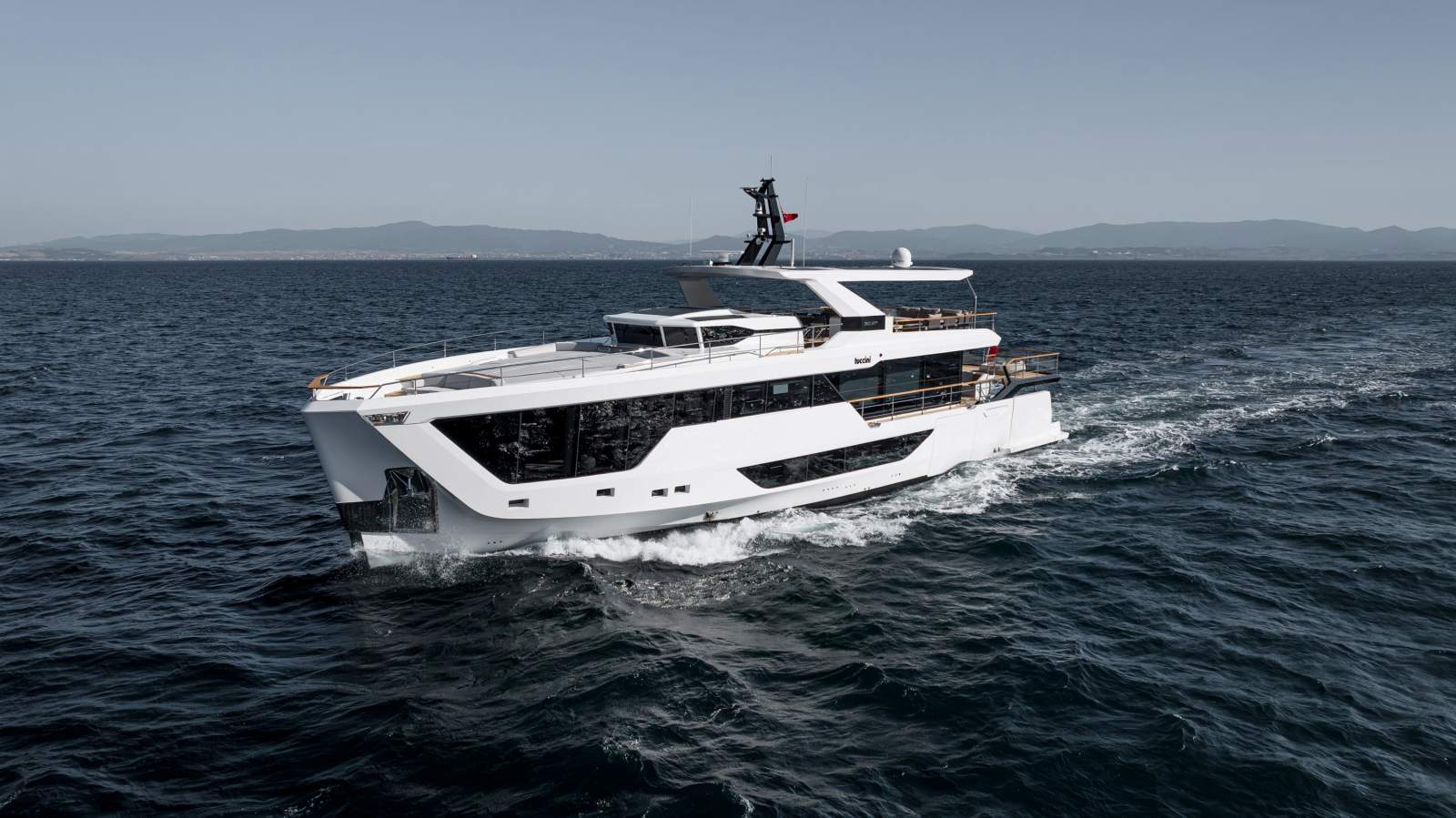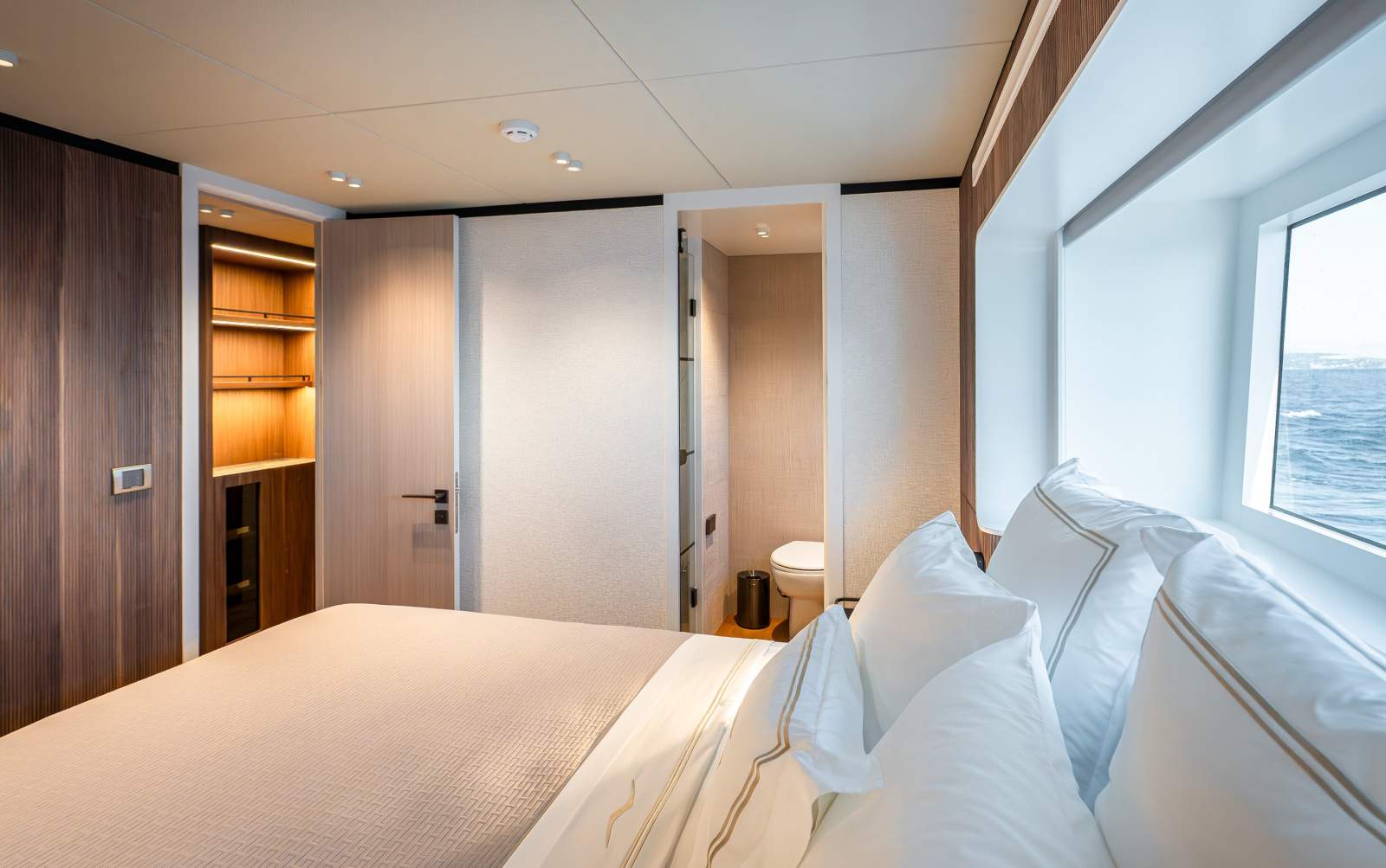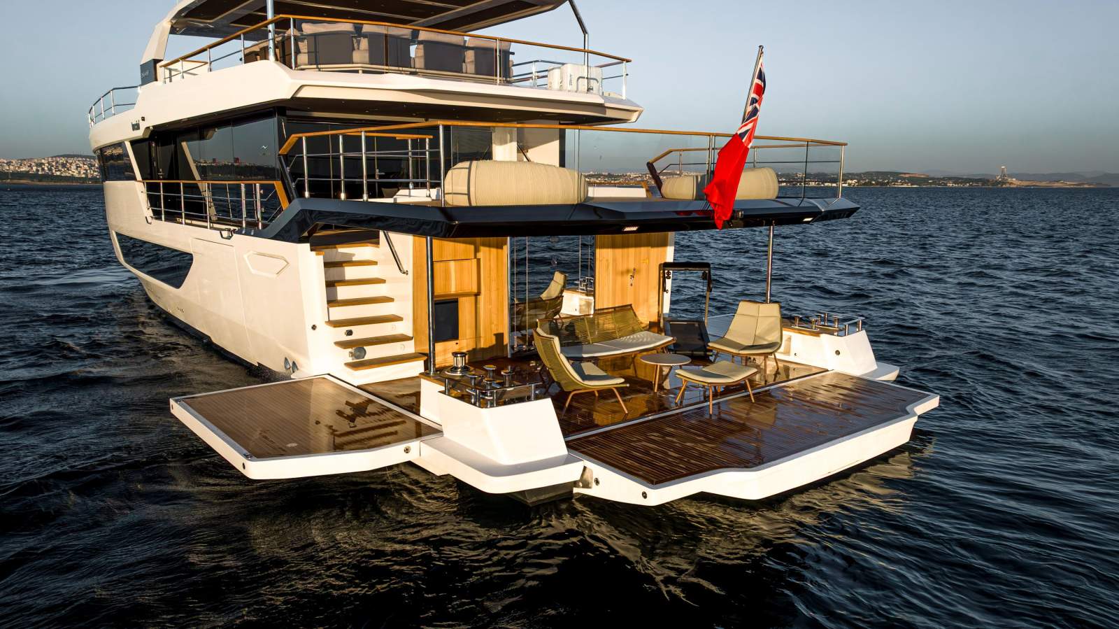 Expansive outdoor spaces are a hallmark of the 30XP. The aft beach club opens on three sides to create a waterside lounge that connects seamlessly to the sea. Forward, generous seating and sunpads invite you to relax at anchor, while the flybridge provides shaded lounging and entertaining space. Inside, the saloon is framed by panoramic windows and sliding doors that bathe the interior in natural light, and a main-deck owner's suite offers floor-to-ceiling glazing and a private ensuite. Four guest cabins on the lower deck accommodate up to eight guests, and crew quarters forward house the captain and four crew.