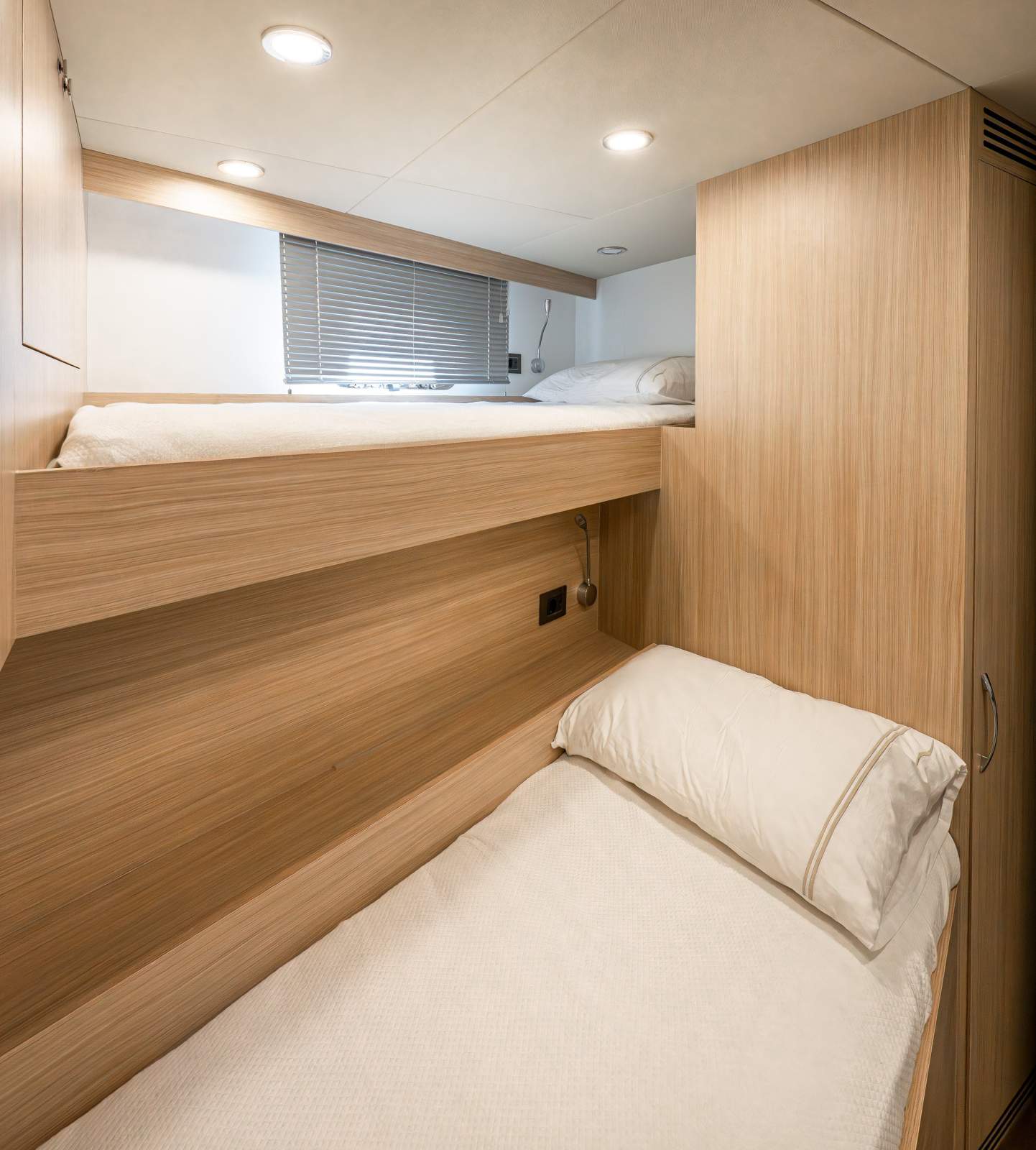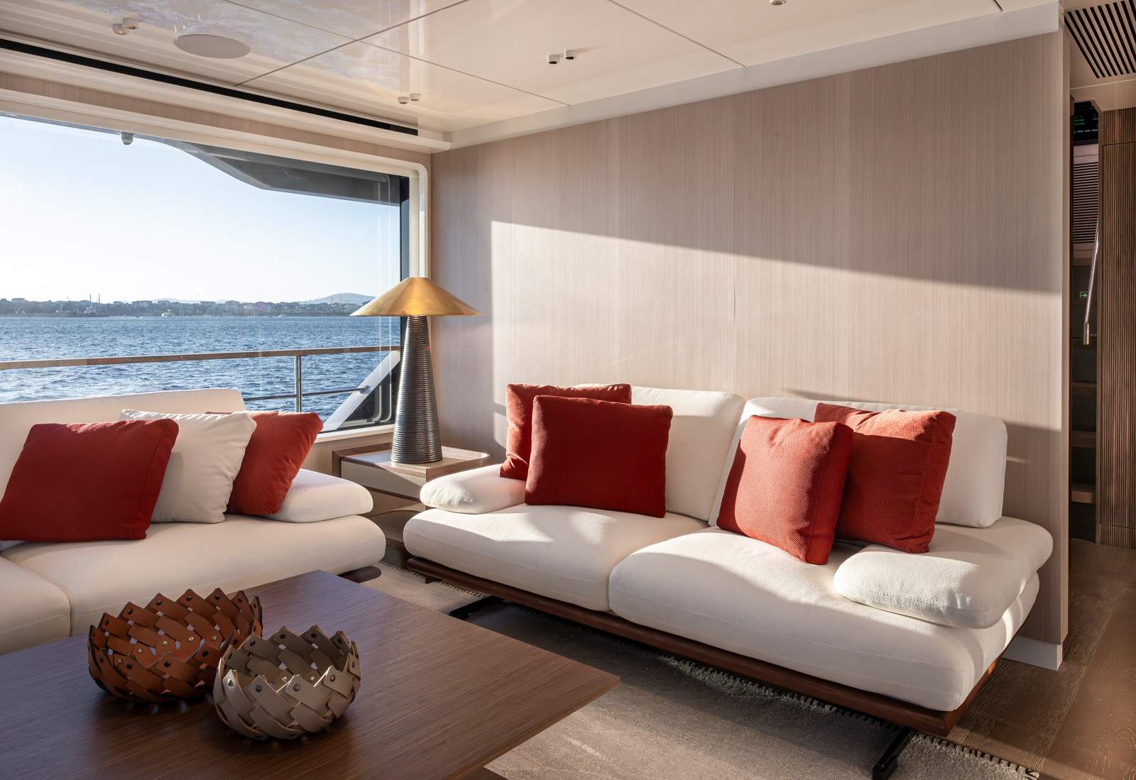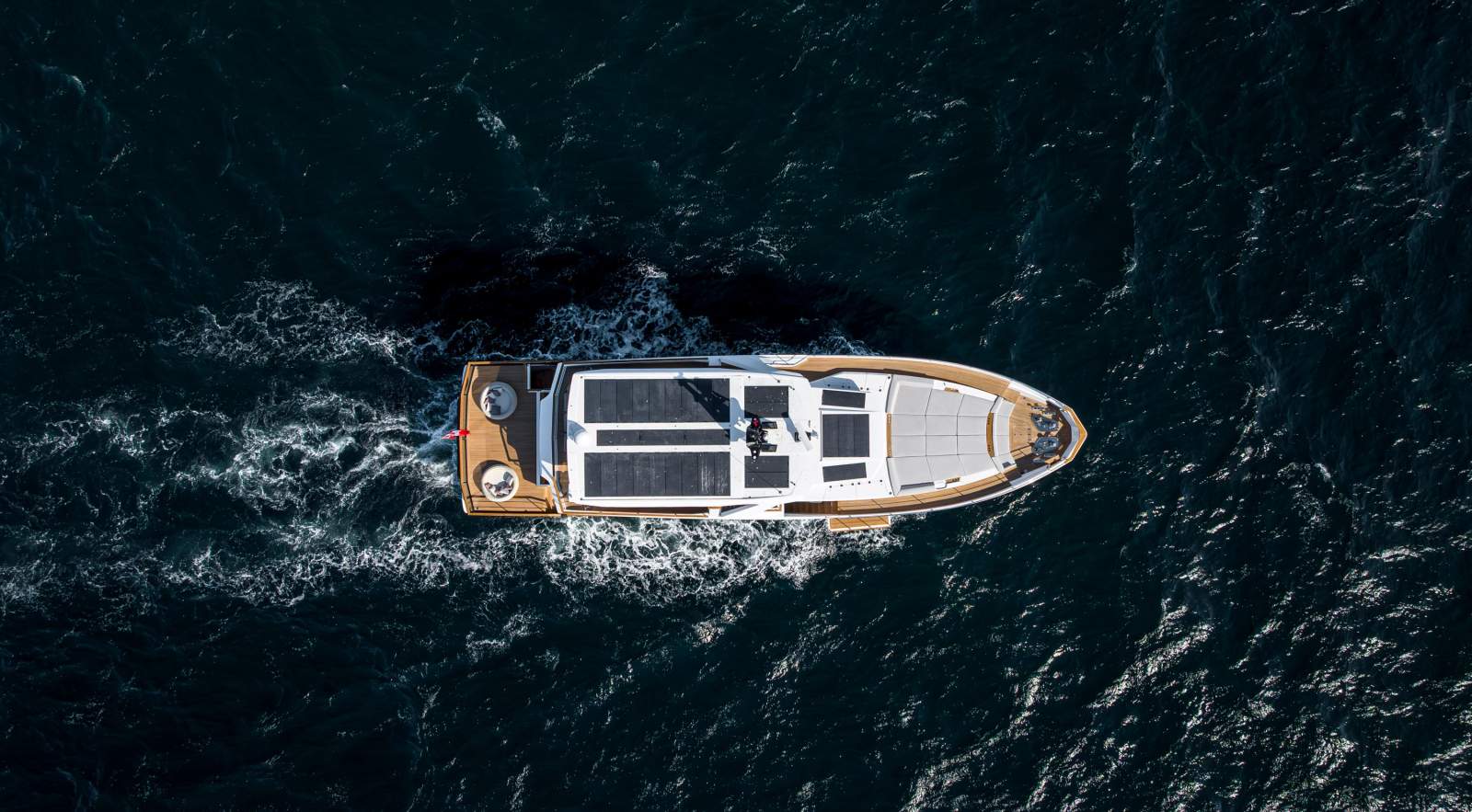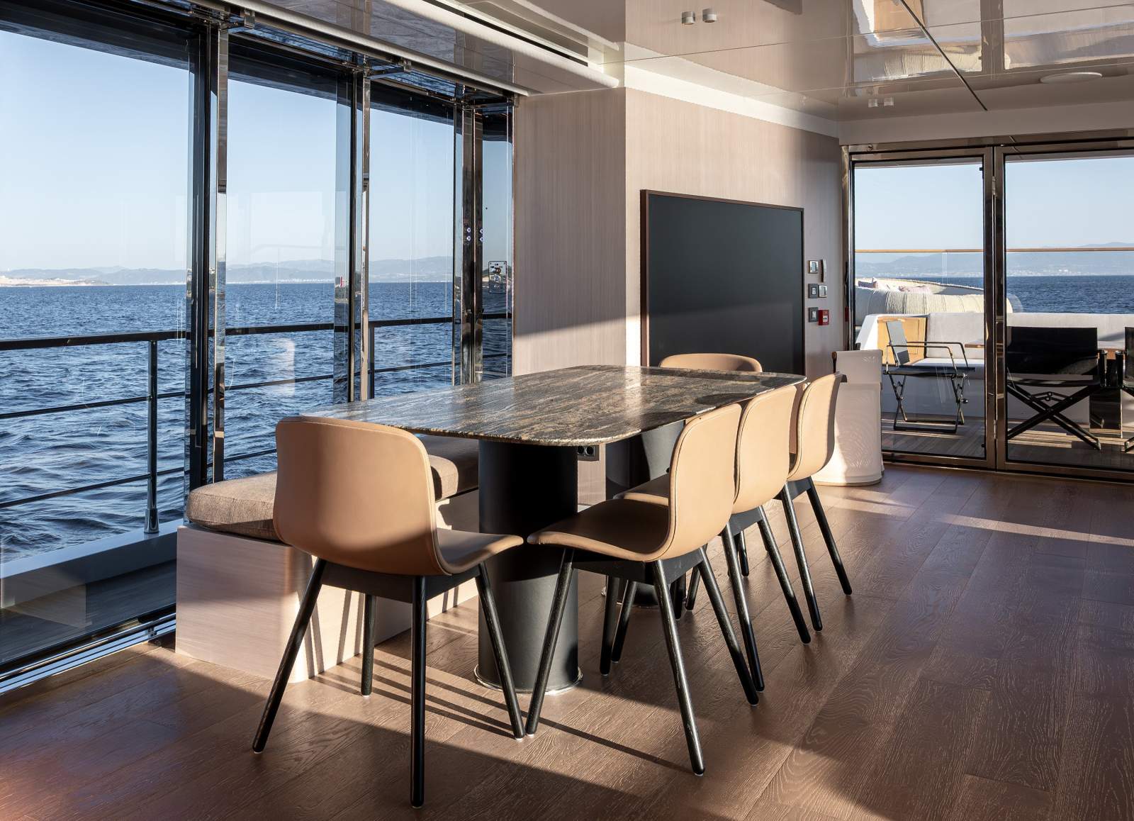 Expansive outdoor spaces are a hallmark of the 30XP. The aft beach club opens on three sides to create a waterside lounge that connects seamlessly to the sea. Forward, generous seating and sunpads invite you to relax at anchor, while the flybridge provides shaded lounging and entertaining space. Inside, the saloon is framed by panoramic windows and sliding doors that bathe the interior in natural light, and a main-deck owner's suite offers floor-to-ceiling glazing and a private ensuite. Four guest cabins on the lower deck accommodate up to eight guests, and crew quarters forward house the captain and four crew.