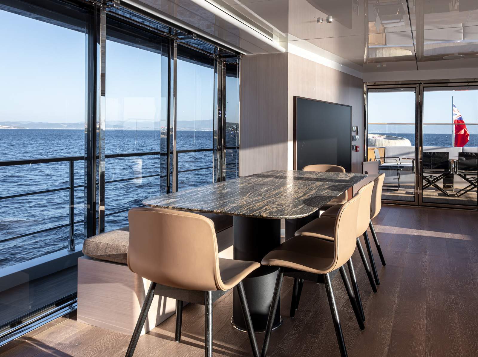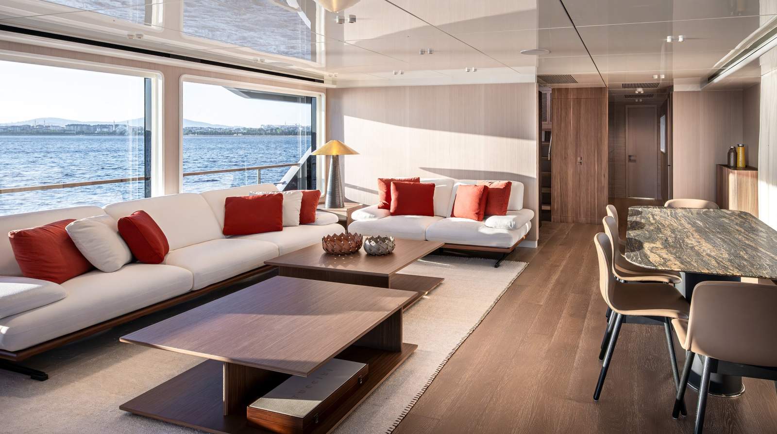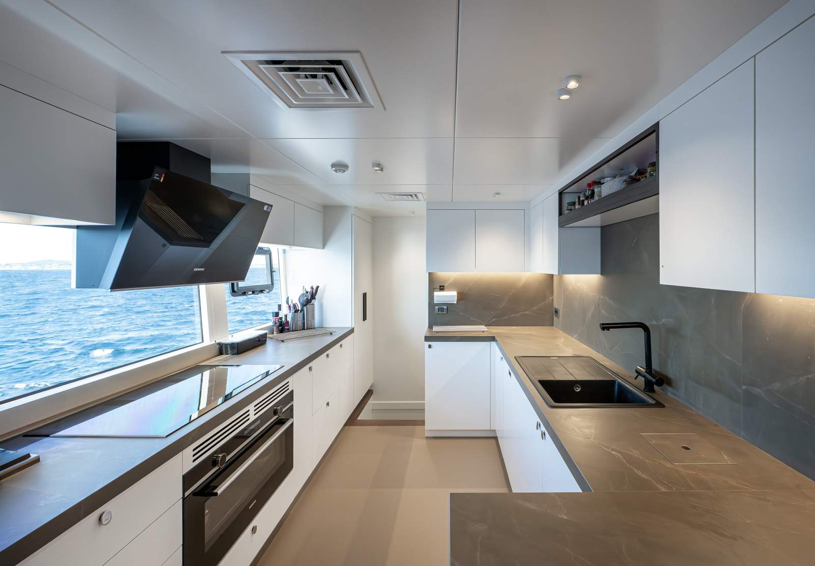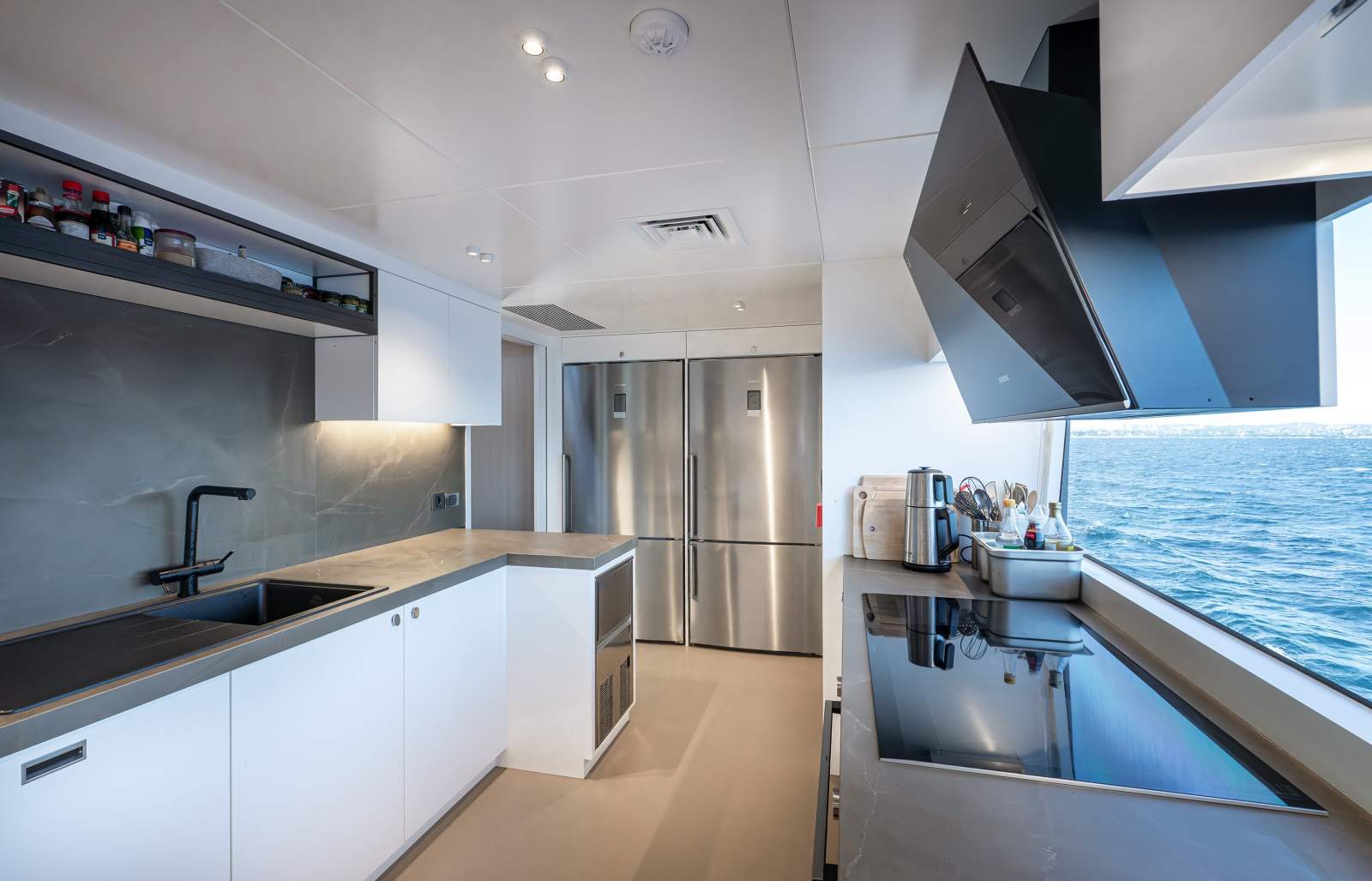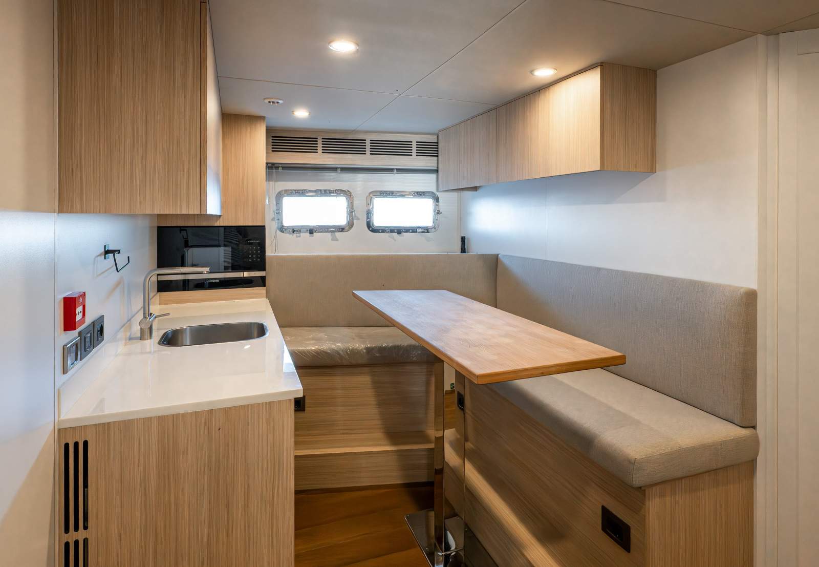 Galley: High-end appliances and smart storage solutions provide efficient service to guest areas.
