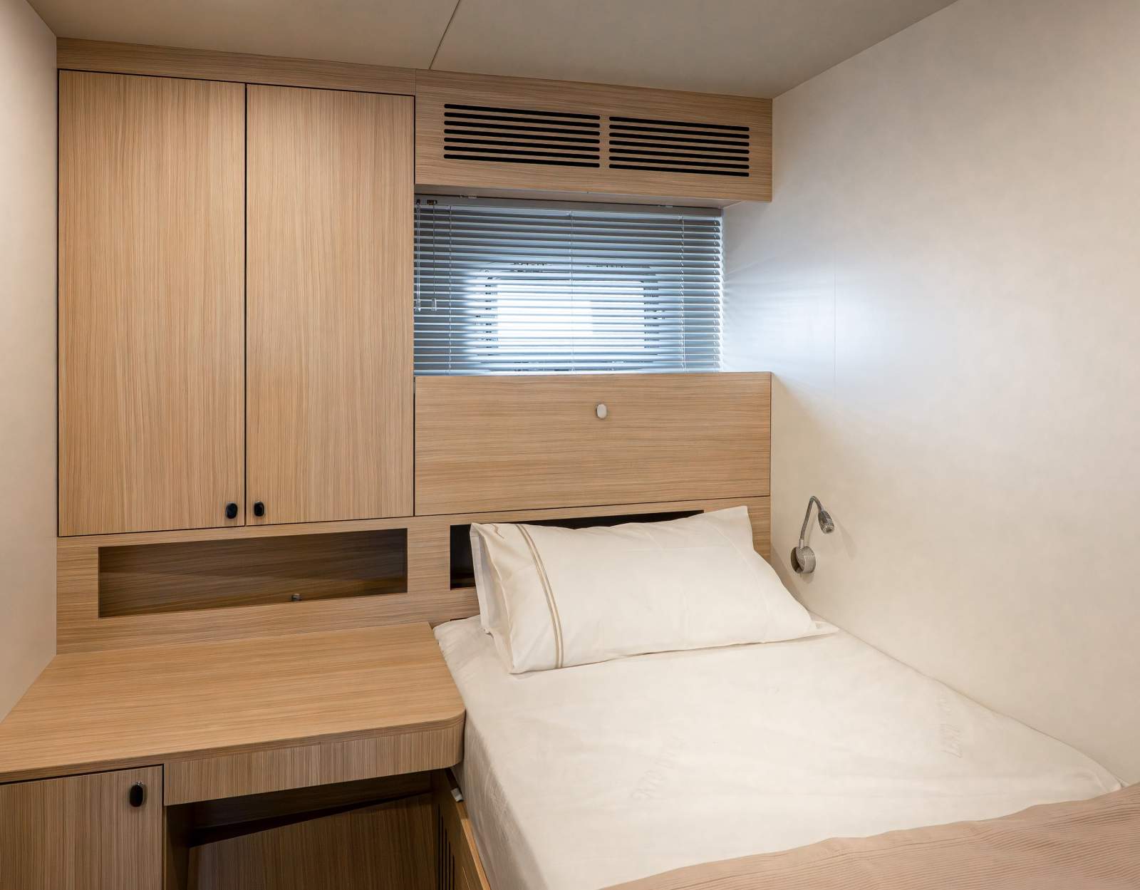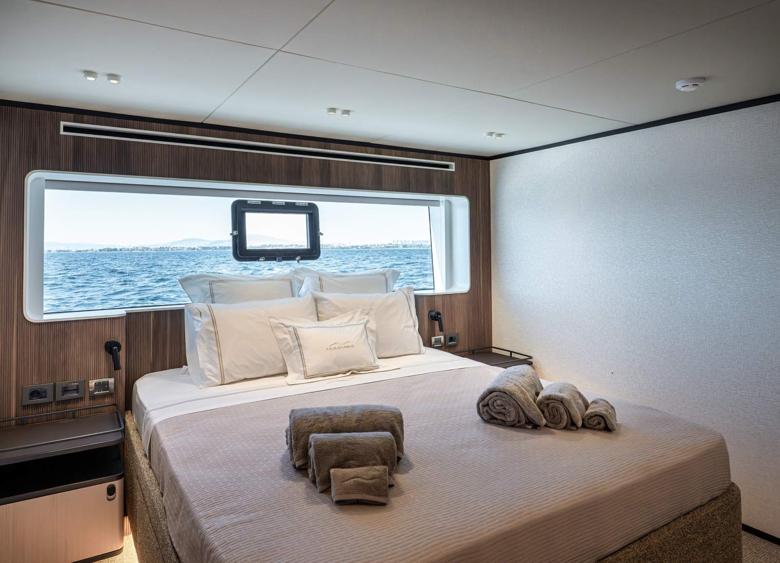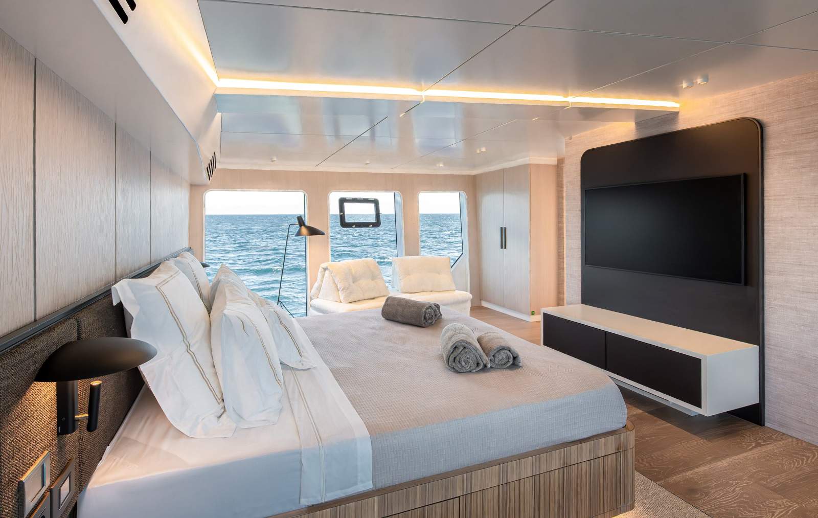 Accomodation: Master suite on main deck with floor-to-ceiling windows; four en-suite guest cabins on lower deck; crew quarters for 5 with captain's cabin and two twin cabins