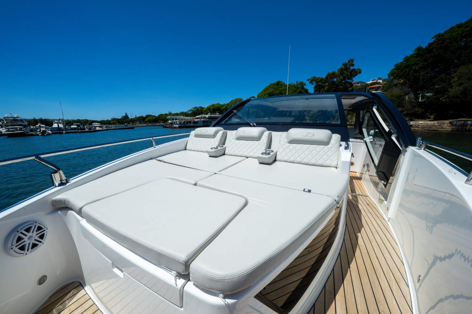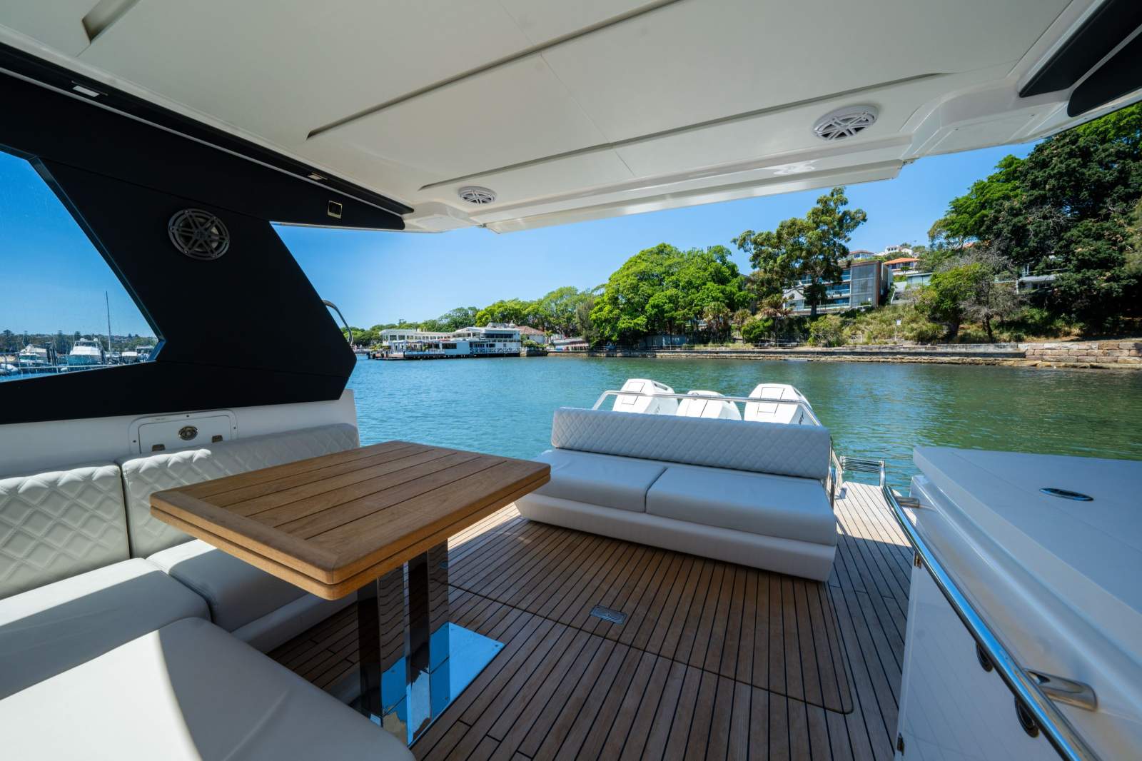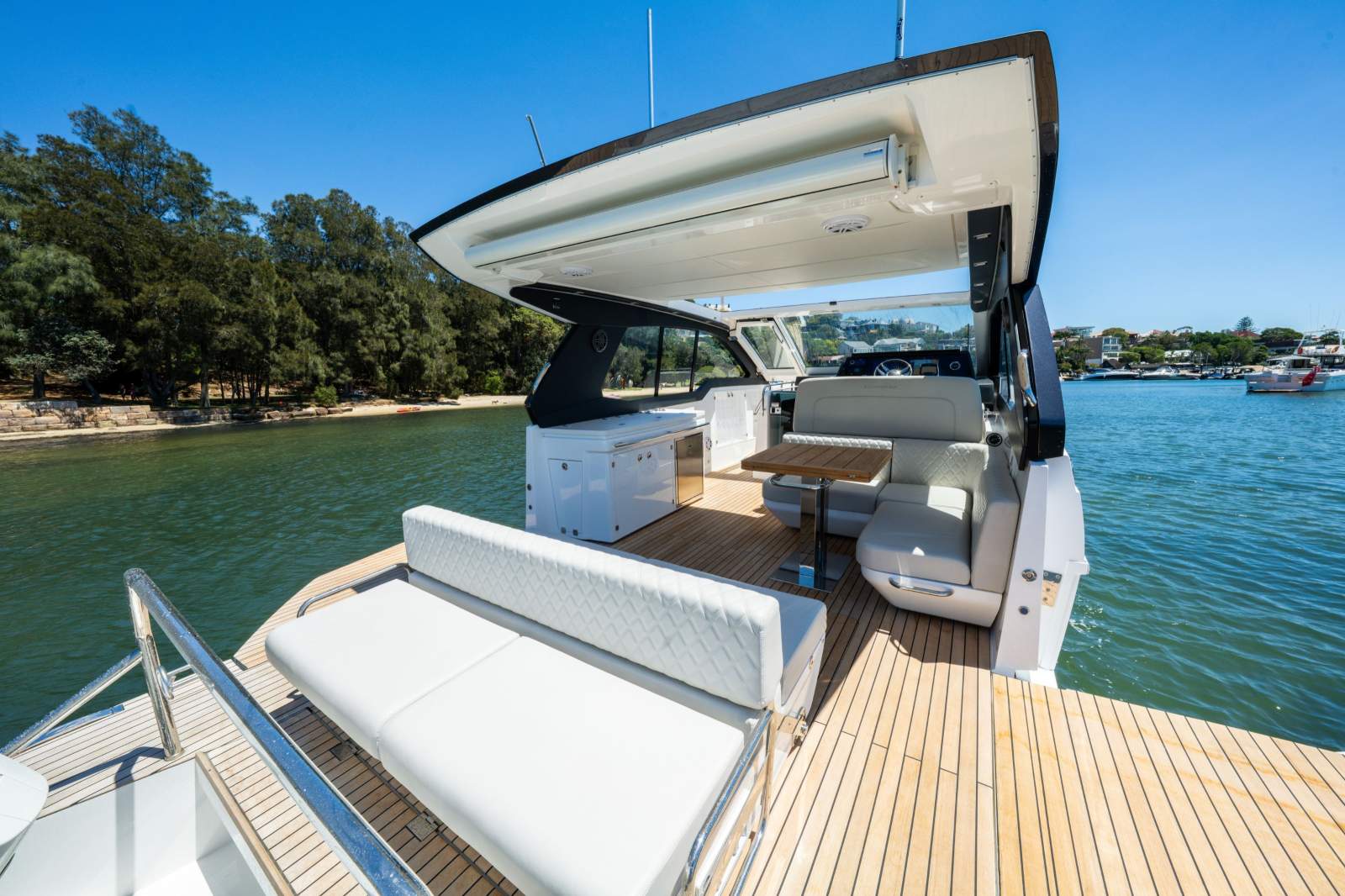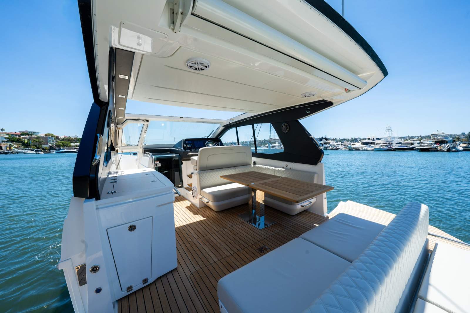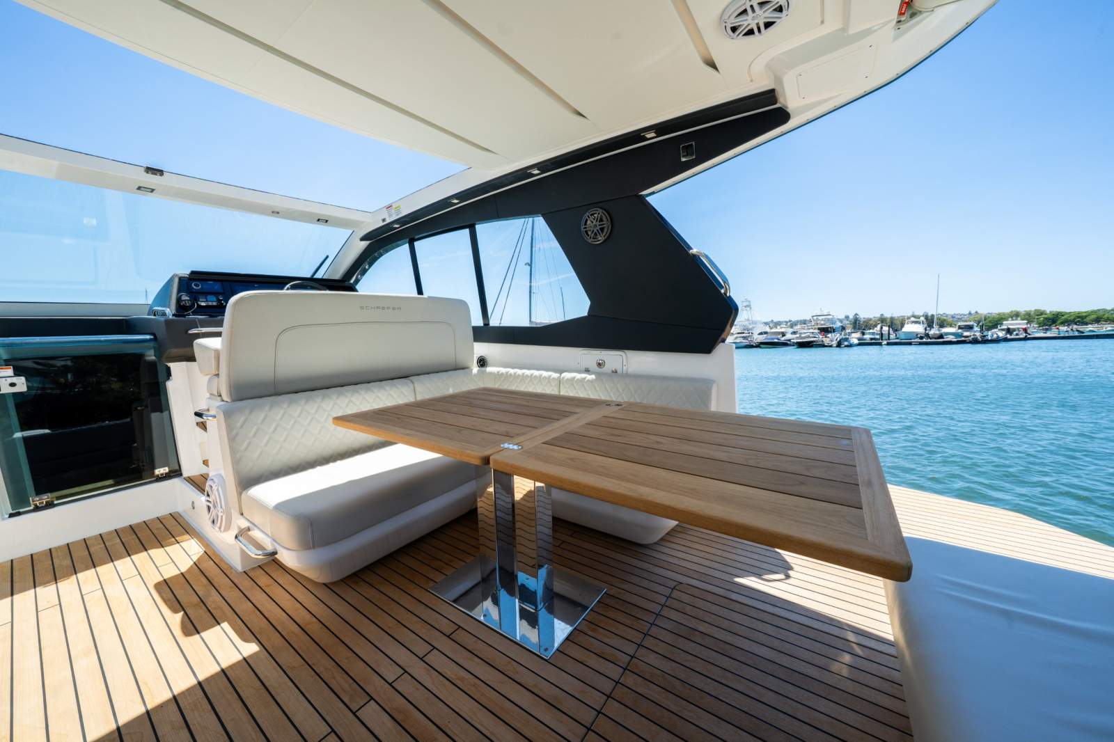 The Schaefer 380 can comfortably fit up to 14 people during the day and 4 overnight. Whether you're planning a day out with friends or a family getaway, this boat has got you covered. The flexible deck layouts let you choose between a gourmet station with a grill at the stern or a sunpad/bench seating. The drop-down balconies, which come standard on this model, significantly expand your space for relaxing and entertaining, making the boat feel much larger than it is.