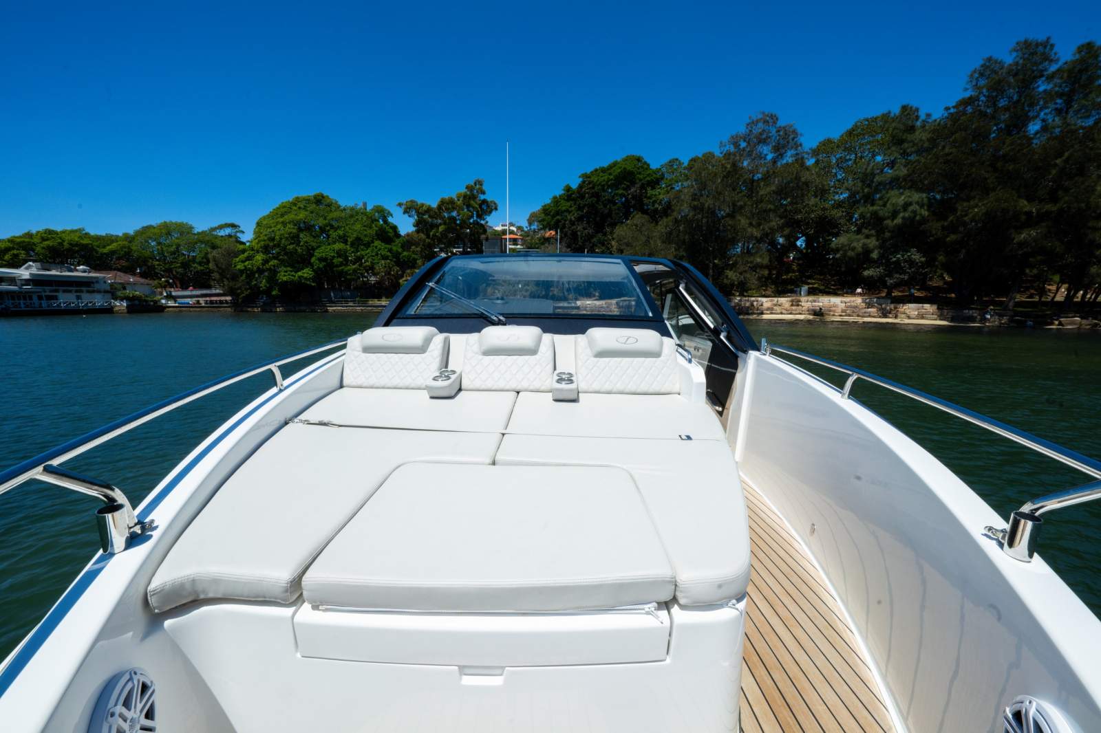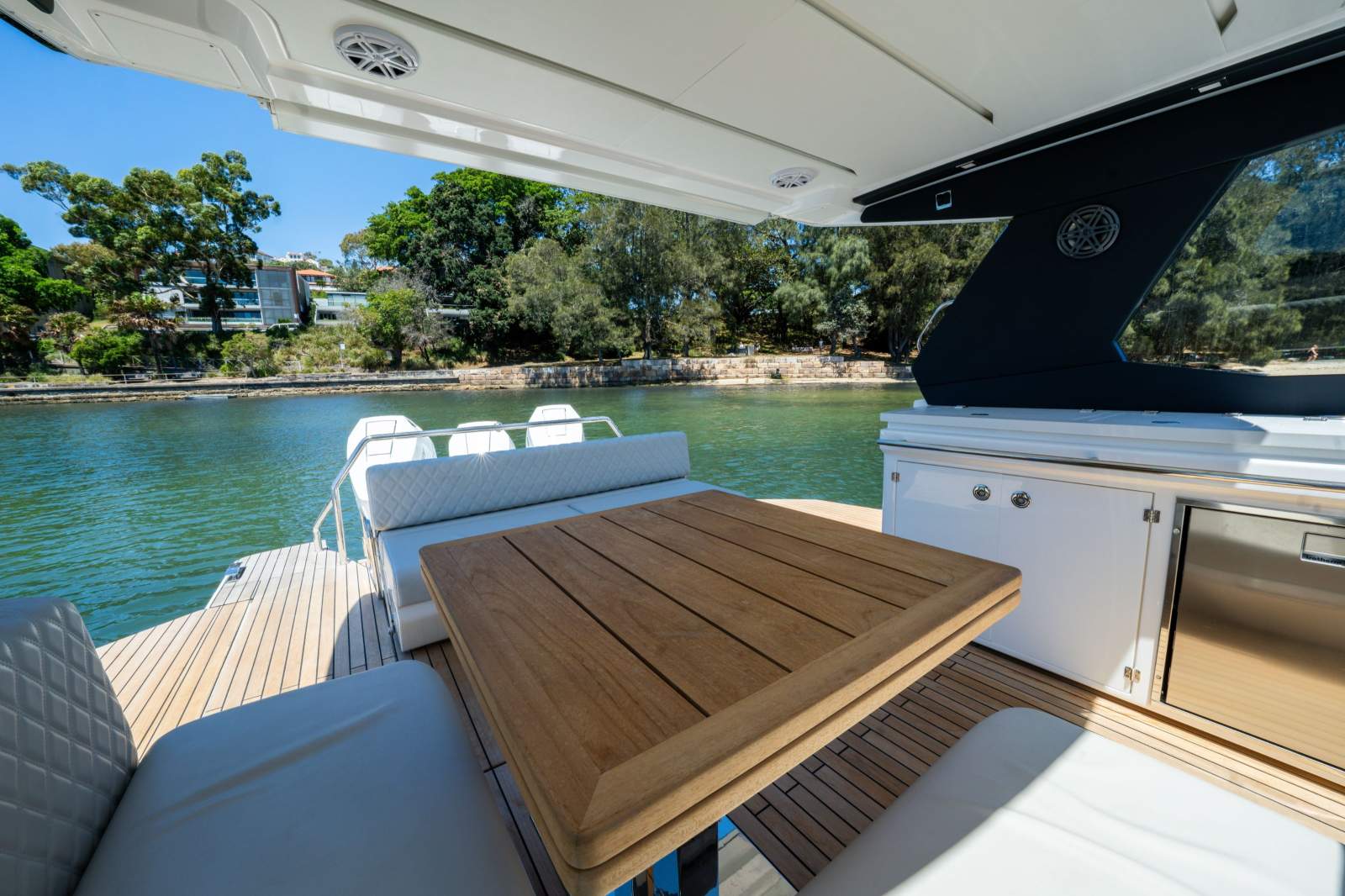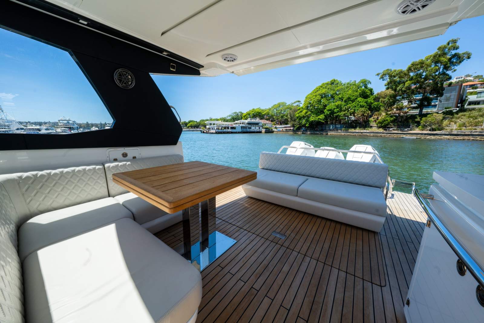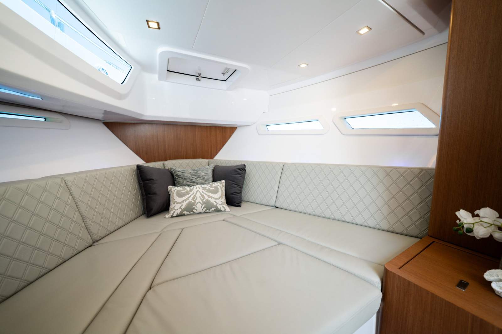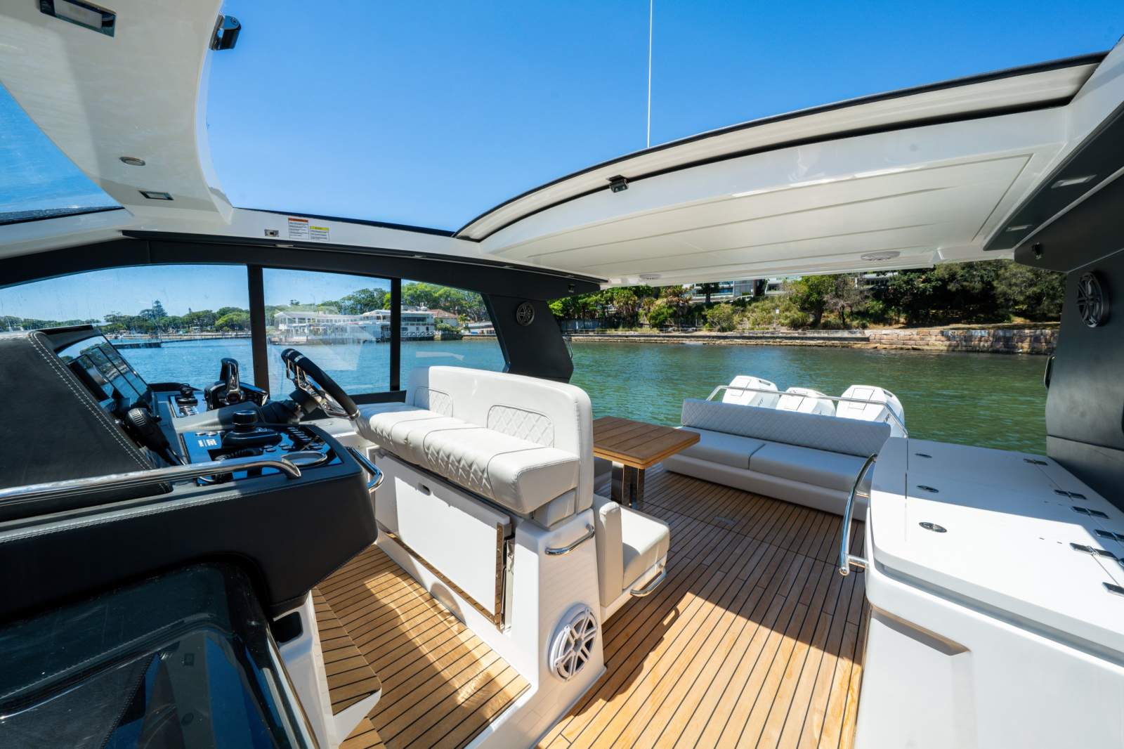 The Schaefer 380 can comfortably fit up to 14 people during the day and 4 overnight. Whether you're planning a day out with friends or a family getaway, this boat has got you covered. The flexible deck layouts let you choose between a gourmet station with a grill at the stern or a sunpad/bench seating. The drop-down balconies, which come standard on this model, significantly expand your space for relaxing and entertaining, making the boat feel much larger than it is.
