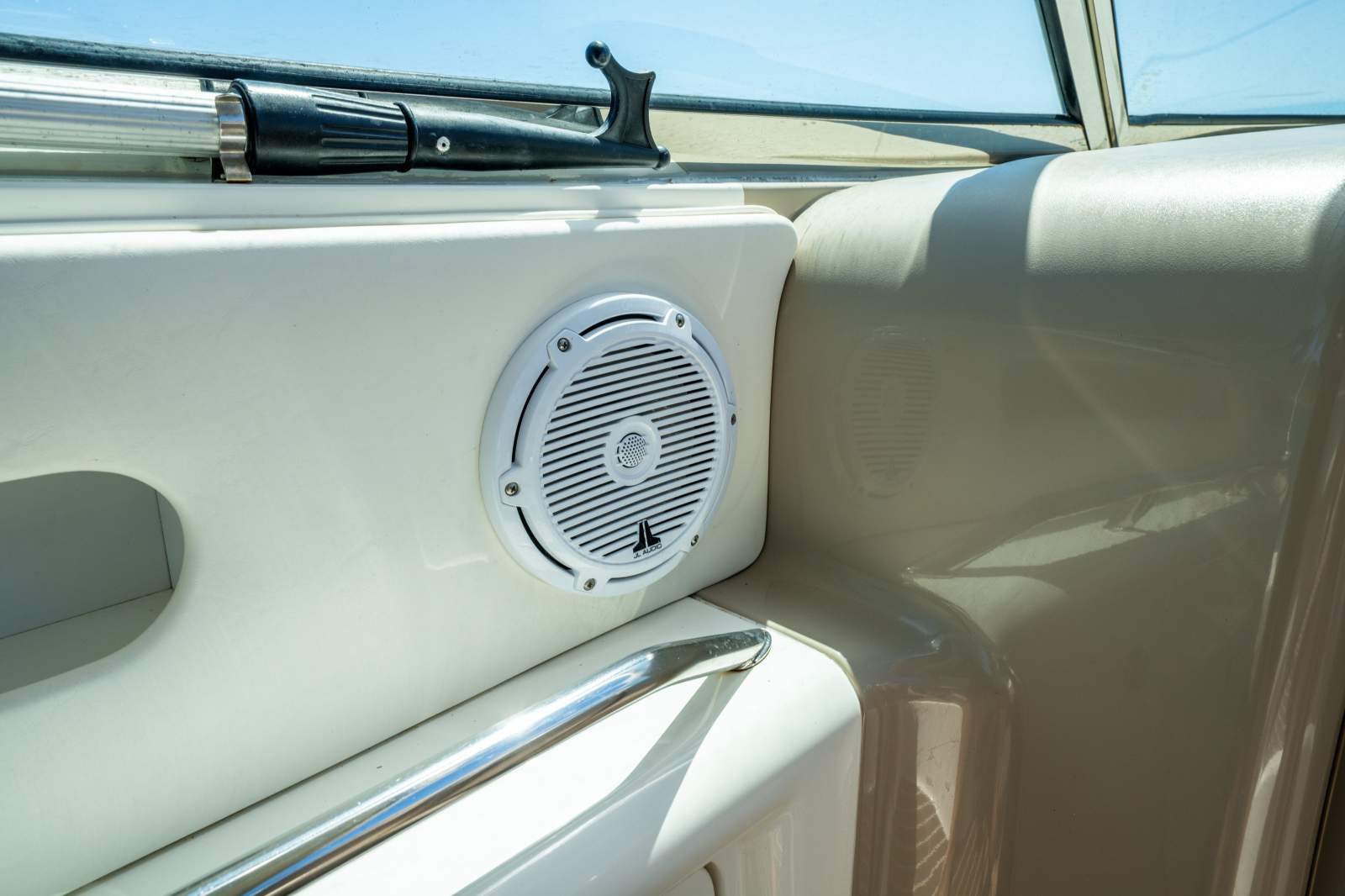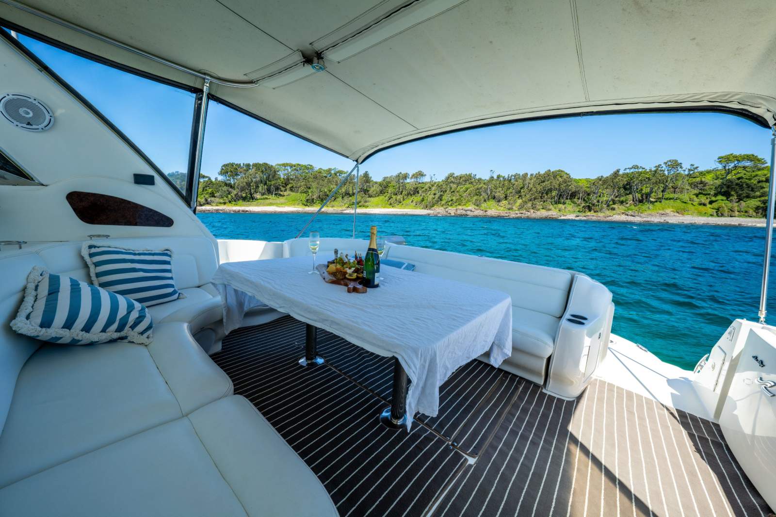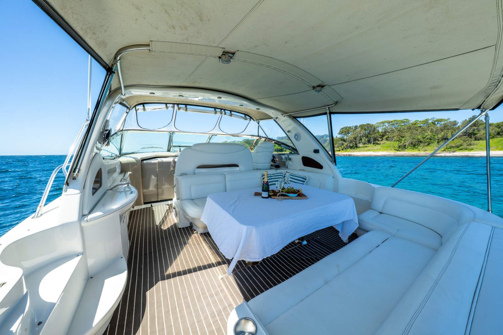 Other highlights include, A large, U-shaped aft seating area with a large table. A wet bar with a refrigerator (or ice maker) and ready for outdoor TV to be fitted.
