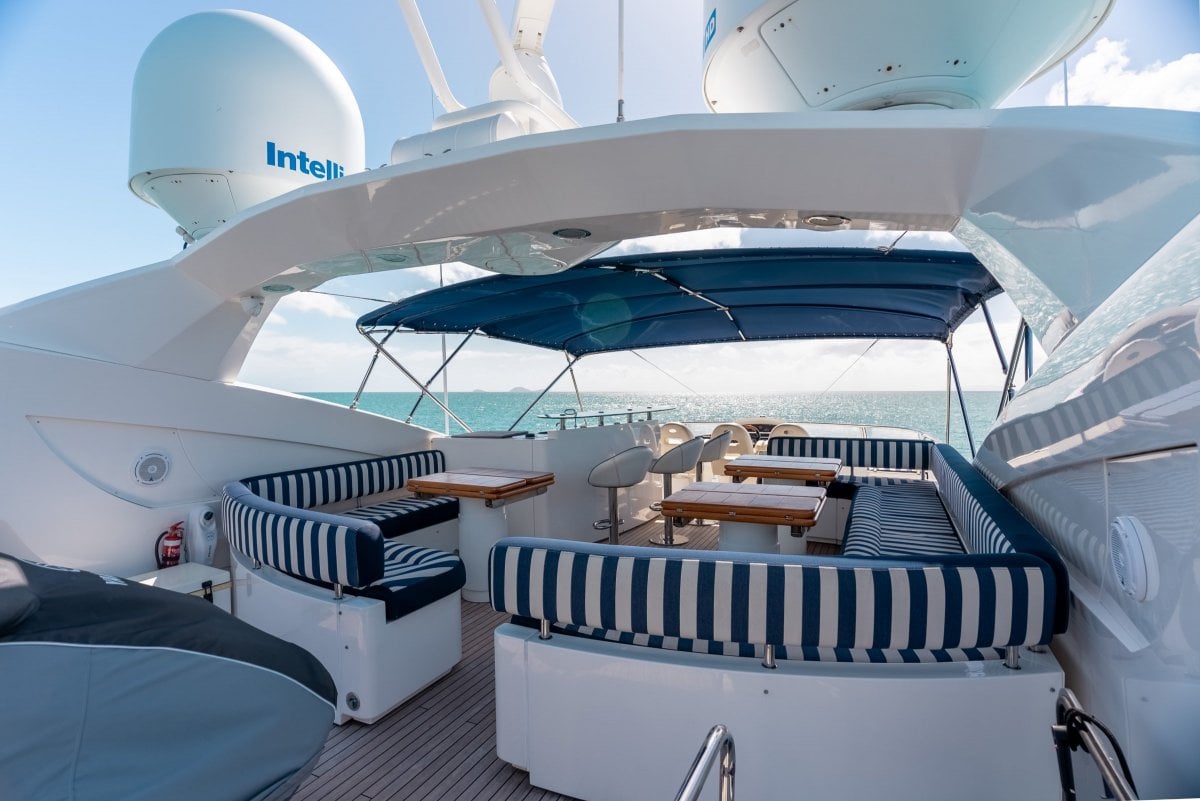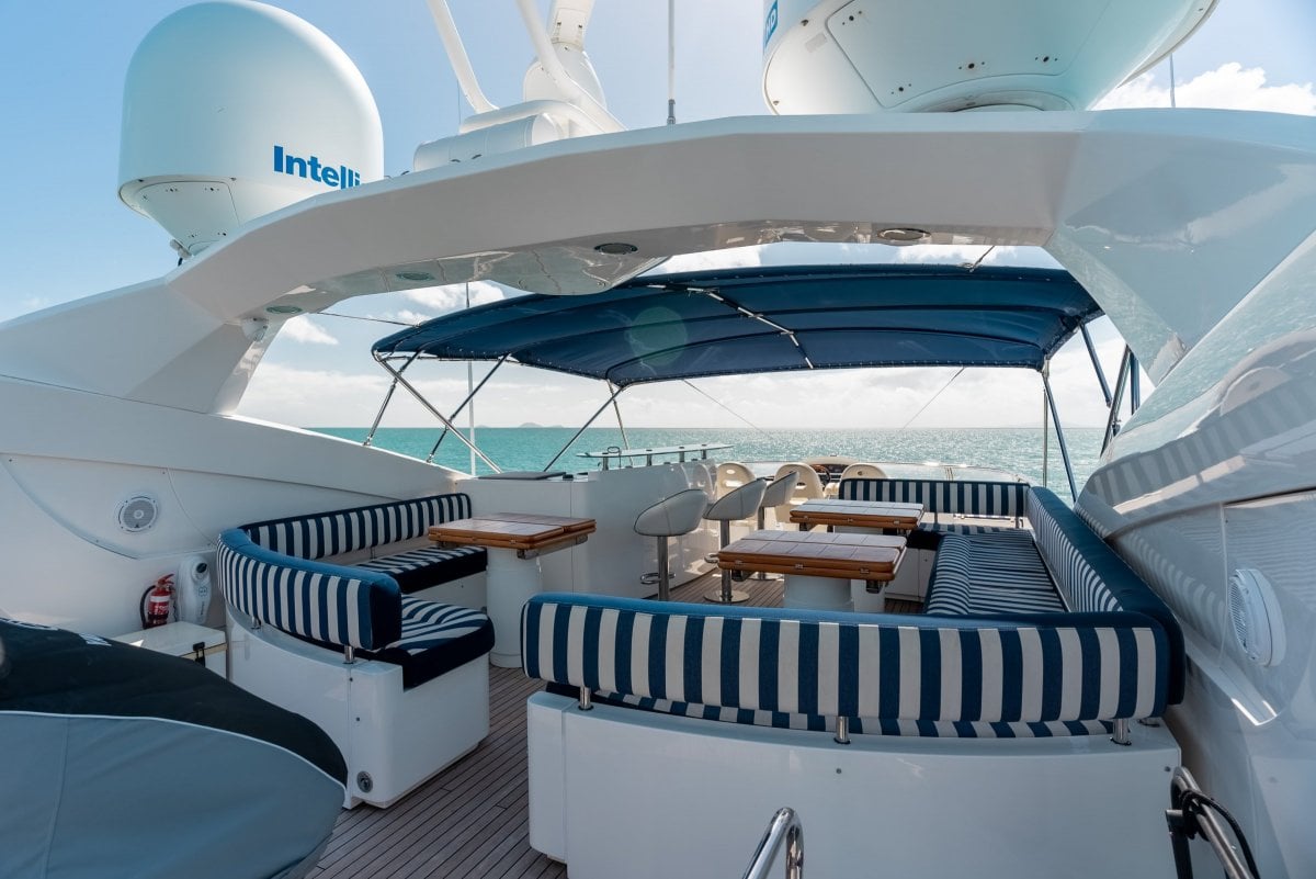 Entertaining aboard "Terraferma" provides so many options, the aft deck for alfresco dining and drinks, the enormous flybridge accommodates large groups of family and friends, the bow fun in the sun with cocktails, or more formal dining in the saloon.
