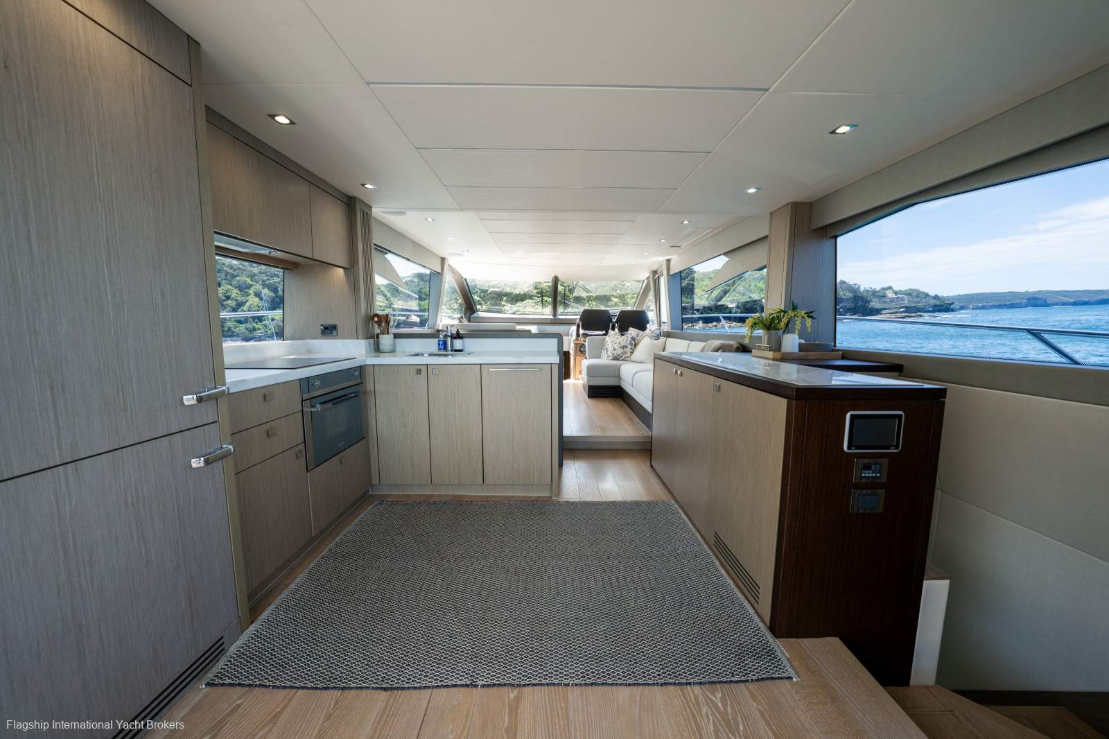 Galley: Galley situated aft on salon deck; dual bowl s/s sink, induction cooktop, convection microwave/ oven under bench, rangehood, dishwasher, plenty of storage and bench space with adjacent servery.