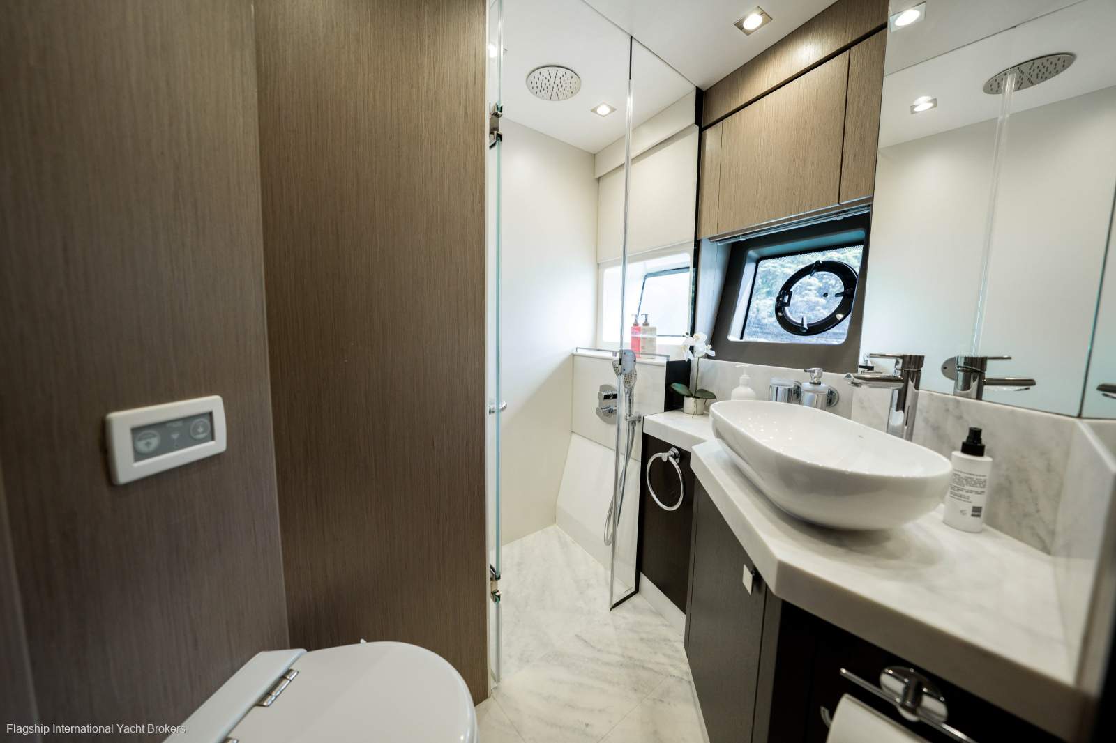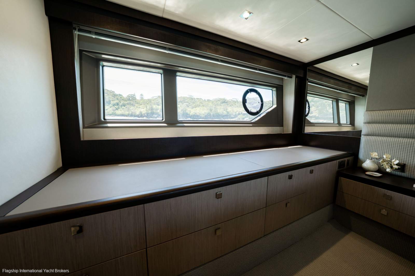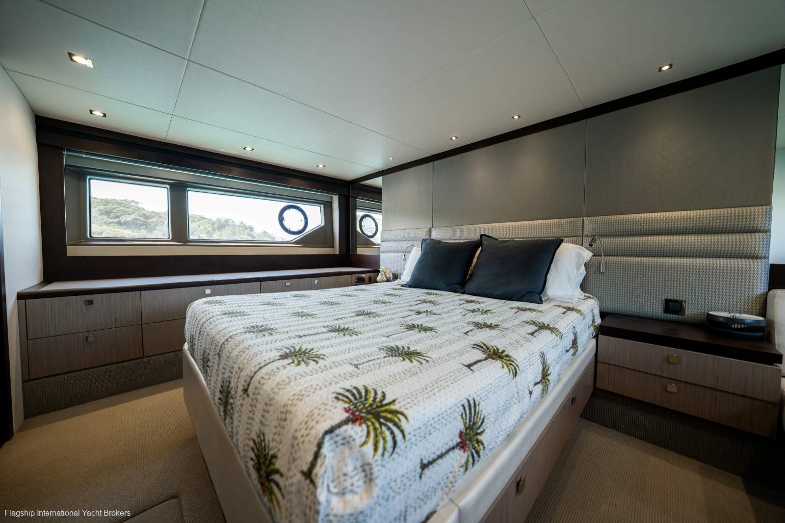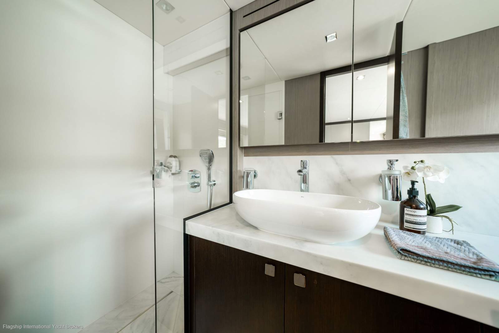 Stepping aboard Mahalo, quality is the essence. Flowing from the aft deck through the big stacker doors to the aft galley and open plan salon/ dining, this stunning yachts beautiful and modern finishes, contrasting satin timbers, lux soft furnishings and panoramic glazing is striking. An abundance of light and space floods the main deck. Forward of the salon and below lay the 3 generous and beautifully appointed guest cabins. The Master stateroom has a separate entrance, it is private, spacious, well appointed and with picture windows at water level, making this a perfectly peaceful Owners sanctuary.