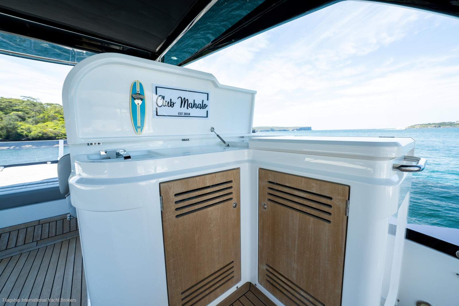 Mahalo offers ample exterior spaces for entertaining, fun in the sun or a quite escape. The vast flybridge boasts a hardtop with sunroof, rear sun awning, loads of seating and dining, wetbar; the aft deck dining; the transom Beach Club or the bow lounges perfect for Sundowners, there's somewhere for everyone.